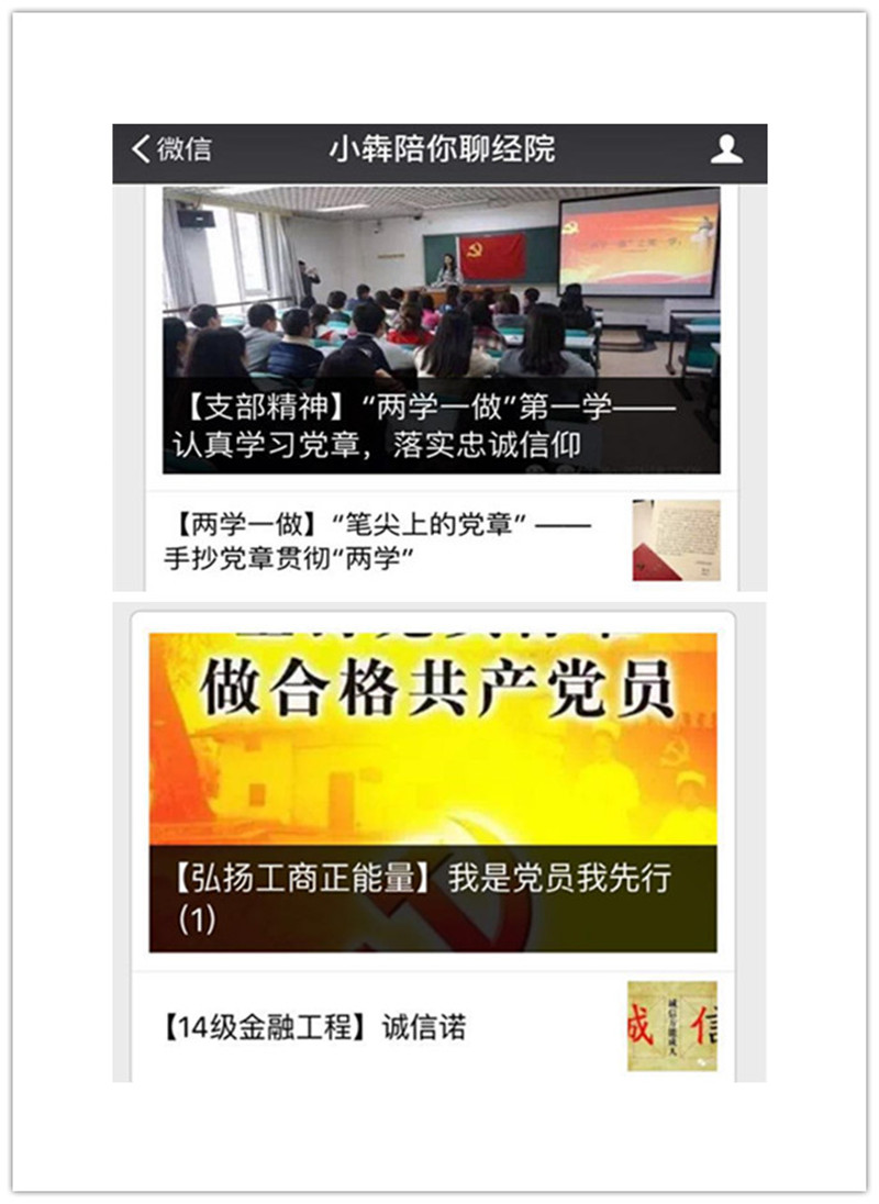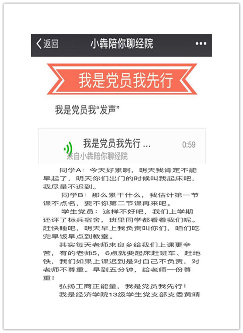 员工党员勇于“发声”,通过公司微信平台“小犇陪你聊经院”,每天推出一期员工党员“弘扬工商正能量”公益语音活动,由员工党员录制1分钟微音频,围绕尊师重道、感恩父母、卫生宿舍、文明礼仪、节约用水、安全用电、走下网络、走出宿舍、走向操场等为主题展开“发声”号召,通过线上线下互动结合,向在校员工弘扬工商正能量,传播核心价值观。
