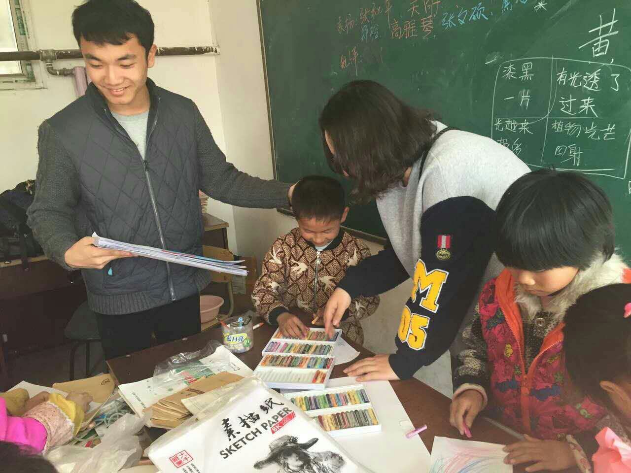 在另一边的美术课上,为了让同学们有更多的时间实践,志愿者在认真且简短地讲解后,将员工们分成了多个小组,使其一起在交流中体会绘画的乐趣,而志愿者则在一旁帮助大家完成绘画作品,引导他们用自己的方式展现其眼中的世界,努力开拓孩子们的思路,使每个人思维的独特性得到发展。