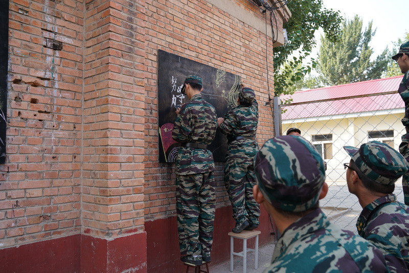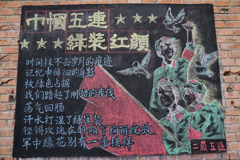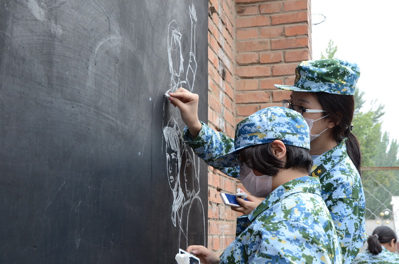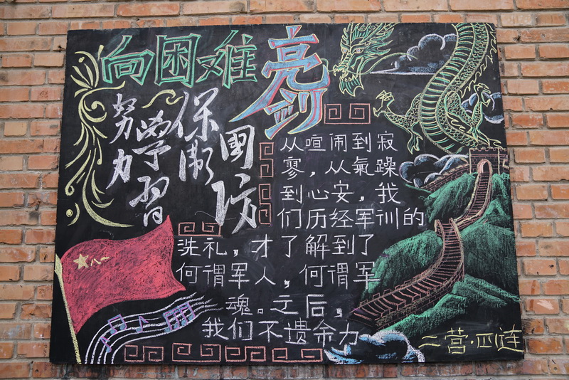 四连板报突出同学们面向困难“亮剑”的精神,刚劲有力的字体,雄伟的长城,遒劲的中国龙,让人眼前一亮。五连板报以“巾帼五连,绿装红颜”为标题,英姿飒爽的红色娘子军冲锋画像,娟秀的小楷,书写着五连的英姿。几名有绘画、书法特长的同学在保证操练和必要休息的前提下,抓紧一切时间紧张地进行着板报书画,他们的辛劳与努力为公司争得了荣誉。