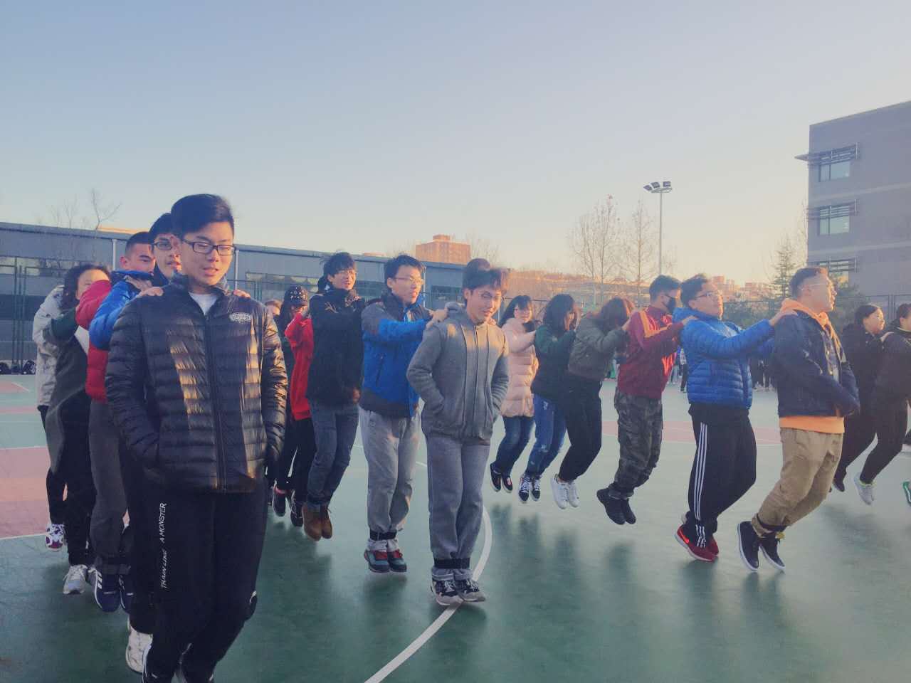 同学们努力发挥出最佳水平,双手紧紧扶住前面同学的肩膀,为保持稳定的节奏齐声喊出口号,配合默契。旁边观赛的各班同学热烈地为队员们加油鼓劲。
