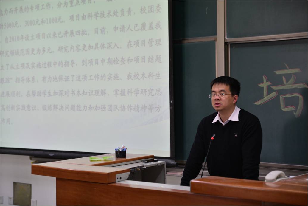 随后科技立项的优秀代表金融121班的孙贺同学做出发言,结合其团队的申请书,为同学们介绍了填写申请书的经验,并向展示了其团队在前期收集的数据与中期准备的论文答辩,分享了在探索过程中遇到并解决困难的经验与感受,使员工更加深入透彻的了解科技立项,激发了员工探求新知、不断提升的兴趣与热情。