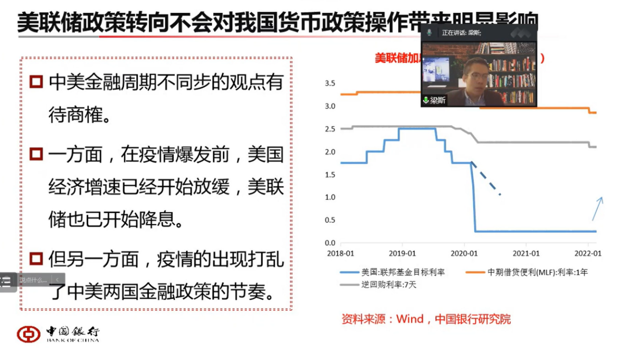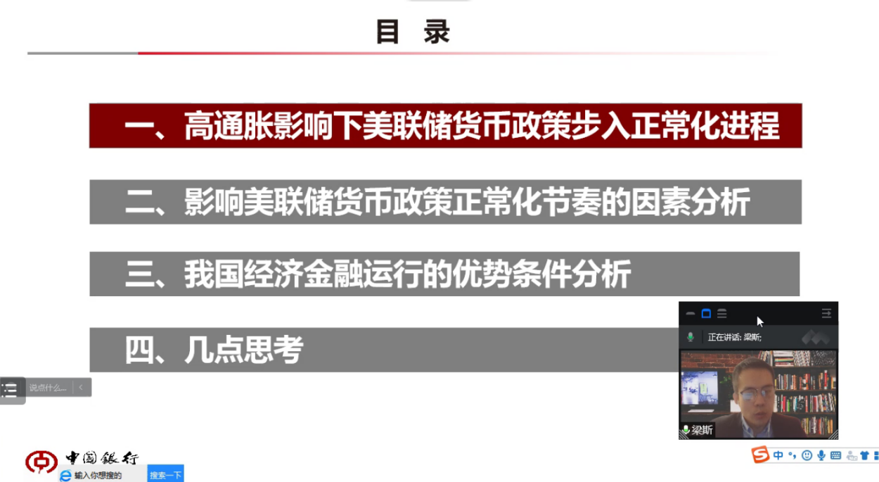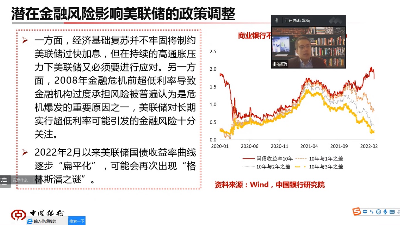 2022年5月18日晚上,国贸学术论坛第二十四期活动在腾讯会议线上顺利举行。本次论坛由中国银行研究院研究员梁斯老师主讲,题目是《如何看待美联储货币政策转向对我国的影响》。活动由国贸系副主任左思明老师主持,郭志超老师和20、21及22级国贸系硕士研究生共同参加了此次论坛。