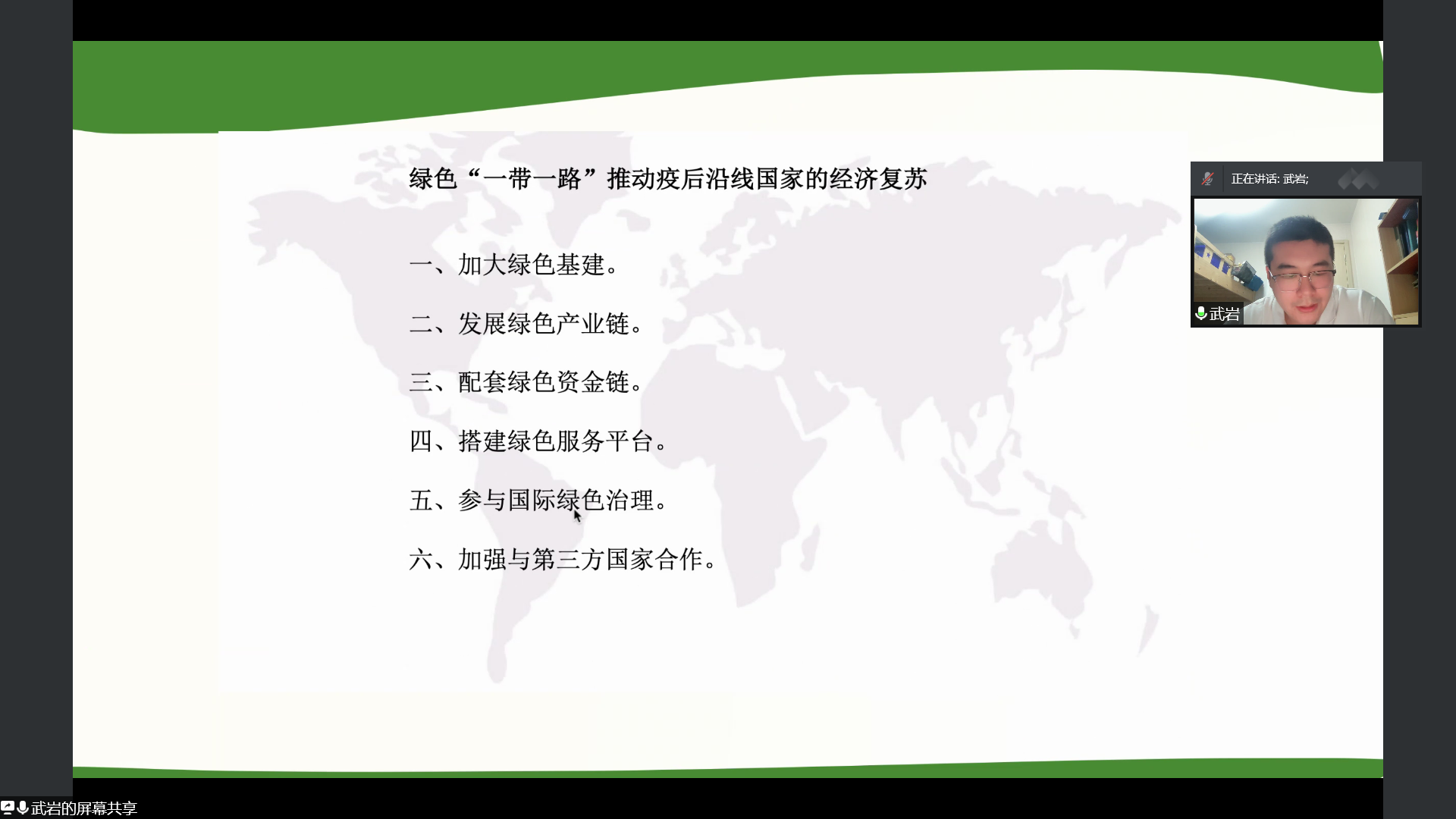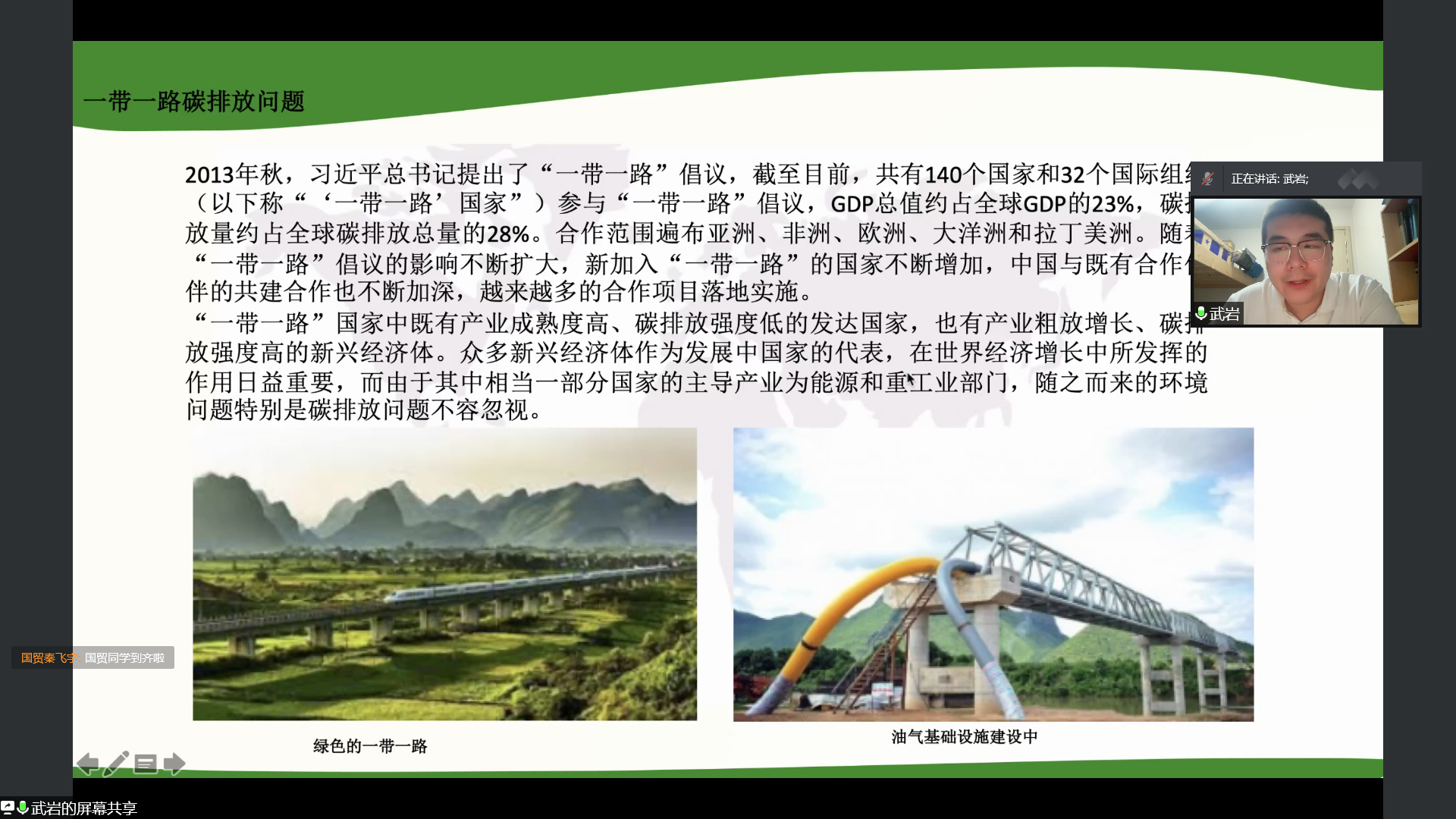 武岩老师近年一带一路碳排放领域研究成果颇丰结合理论成果和实践经验,武老师向同学们讲解了绿色一带一路与全球环境治理的相关问题。首先,武老师讲述了碳排放概念以及气候变化表现的三个方面接着引出一带一路碳排放问题。由于相当一部分沿线国家的主导产业为能源和重工业部门,环境问题特别是碳排放问题不容忽视。之后,武老师针对这些问题,带领同学们回顾了绿色一带一路的中国方案和基本内涵:绿色发展机制、绿色公共产品、绿色共享理念。在介绍完上述内容之后,武老师展示了数篇从不同角度研究绿色一带一路倡议的论文以及实践案例,包括巴基斯坦卡洛特水电项目、埃塞俄比亚阿达玛风电二期项目和马来西亚槟城太阳能生产线等。最后,结合新冠疫情,武老师谈到了绿色一带一路推动疫后沿线国家经济复苏,列举了一些未来中国可能要实施的方案,比如加大绿色基建、发展绿色产业链、配套绿色资金链、搭建绿色服务平台、参与国际绿色治理、加强与第三方国家合作等