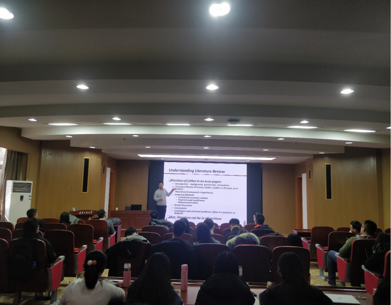 报告会上,白军飞教授首先结合自身的经历,阐述了高效地文献筛选和文献阅读对学术研究的重要性,并指出科技论文就要以最简洁高效的方式传递科技信息。随后,白教授以具体的学术论文为例,详细讲解了如何科学地判断一篇论文是否是规范的经济学研究,以及如何从标题、摘要部分快速的获取文章最有价值的信息。最后,白教授带领大家以国内高水平经济学期刊的文章题目为例,进行了经济学研究的判断和有效信息的提取。