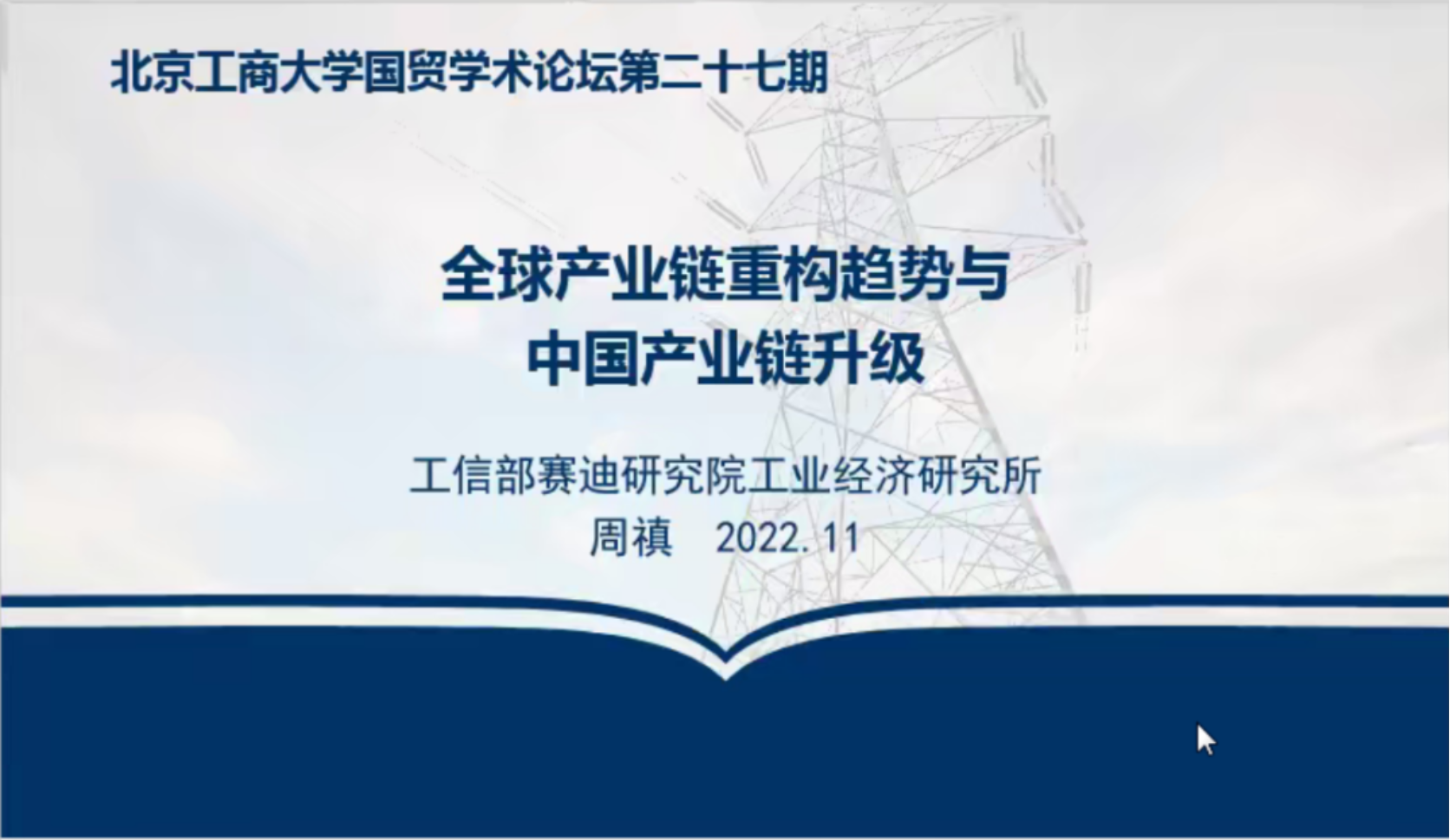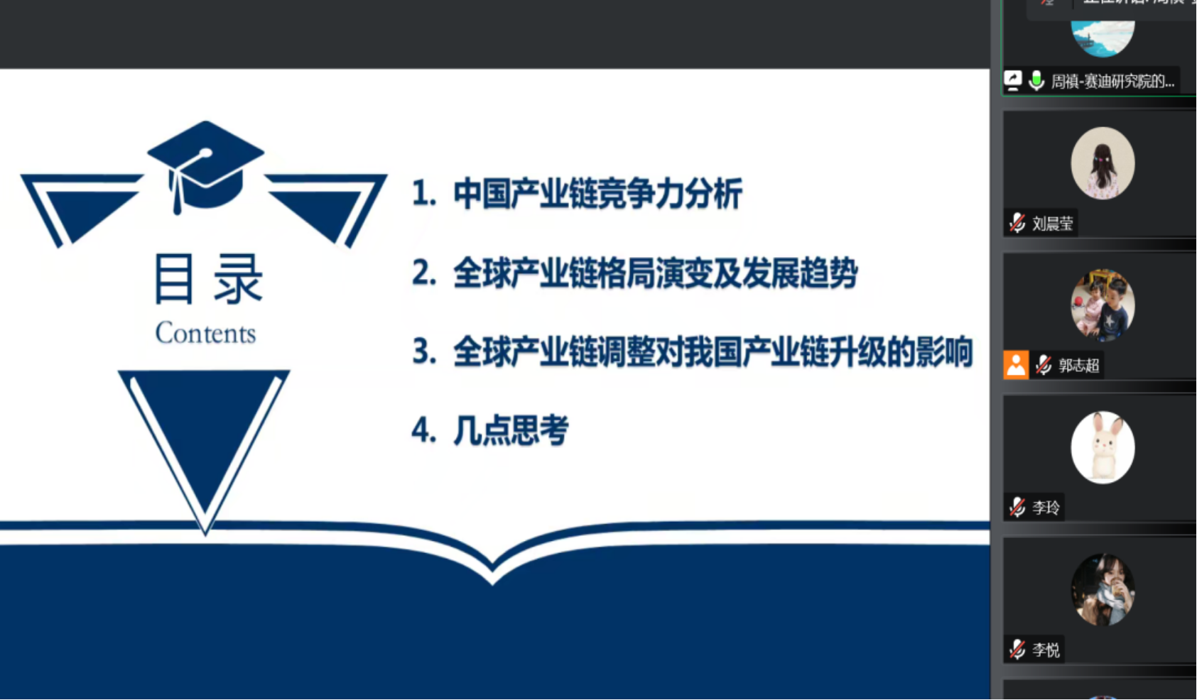 2022年11月23日晚,国际经济与贸易系通过腾讯会议方式在线圆满举办国贸学术论坛第二十七期活动。本次论坛邀请到中国电子信息产业发展研究院周禛研究员为国贸系师生做了题为《全球产业链重构趋势与中国产业链升级》的讲座。论坛由国贸系副主任左思明主持,朱振荣老师、郭志超老师以及21、22级国贸系硕士研究生参加了此次活动。