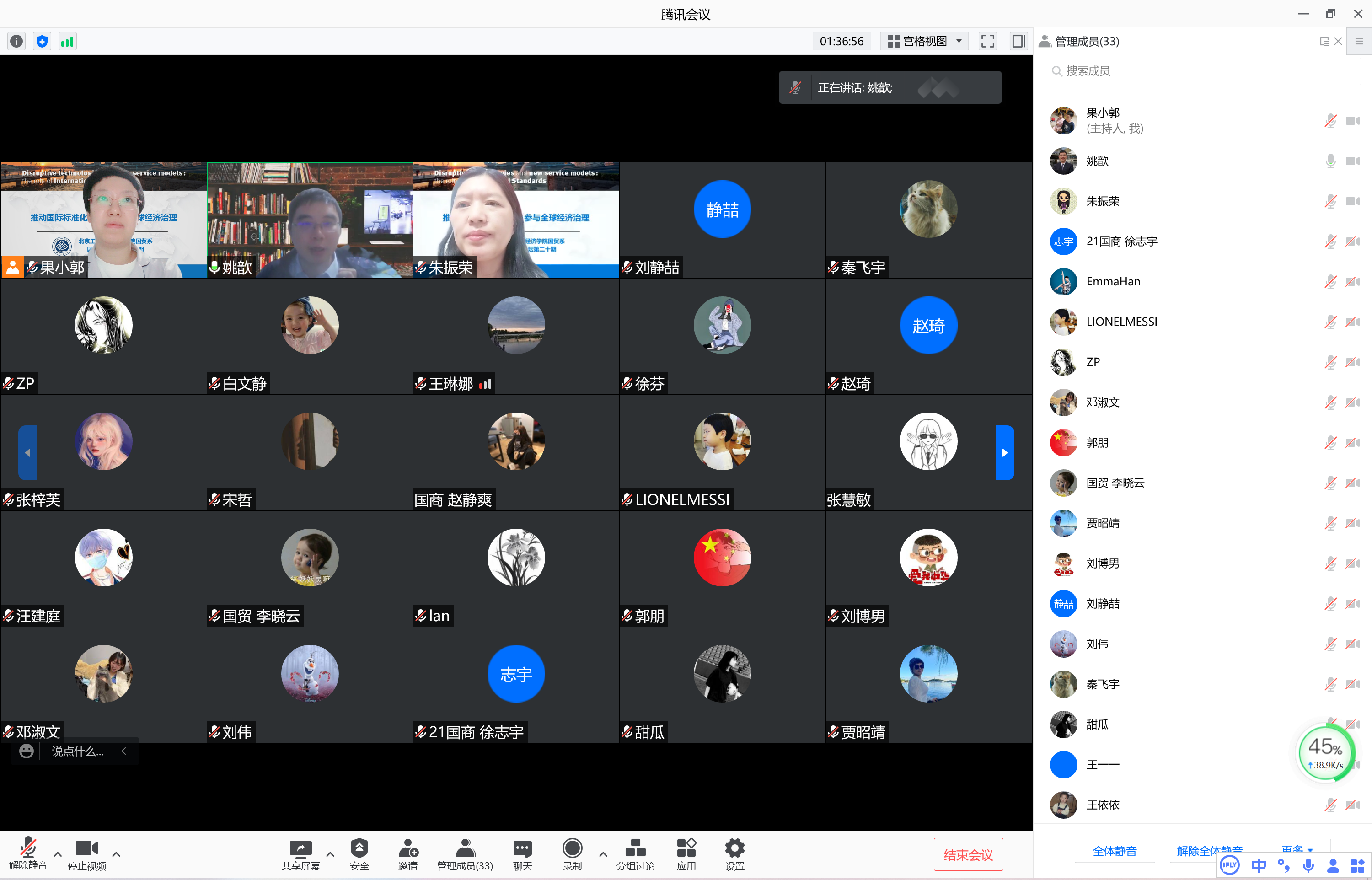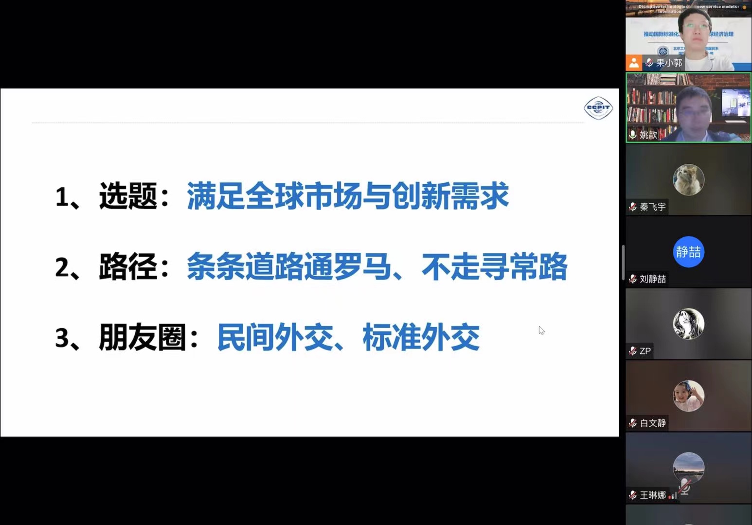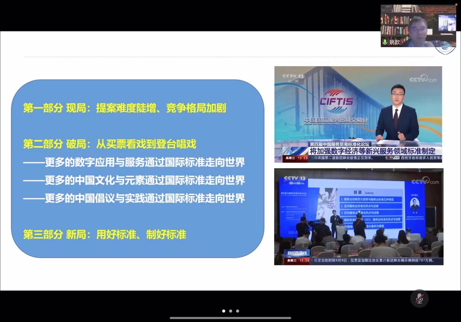 11月1日晚上,国贸学术论坛第二十期活动在腾讯会议线上顺利举行。本次论坛由中国国际贸易促进委员会商业行业委员会秘书长姚歆主讲,题目是《推动国际标准化工作,参与全球经济治理》。活动由国贸系副主任郭志超主持,系主任朱振荣、徐芬老师和全体21级国贸系硕士研究生共同参加了此次论坛