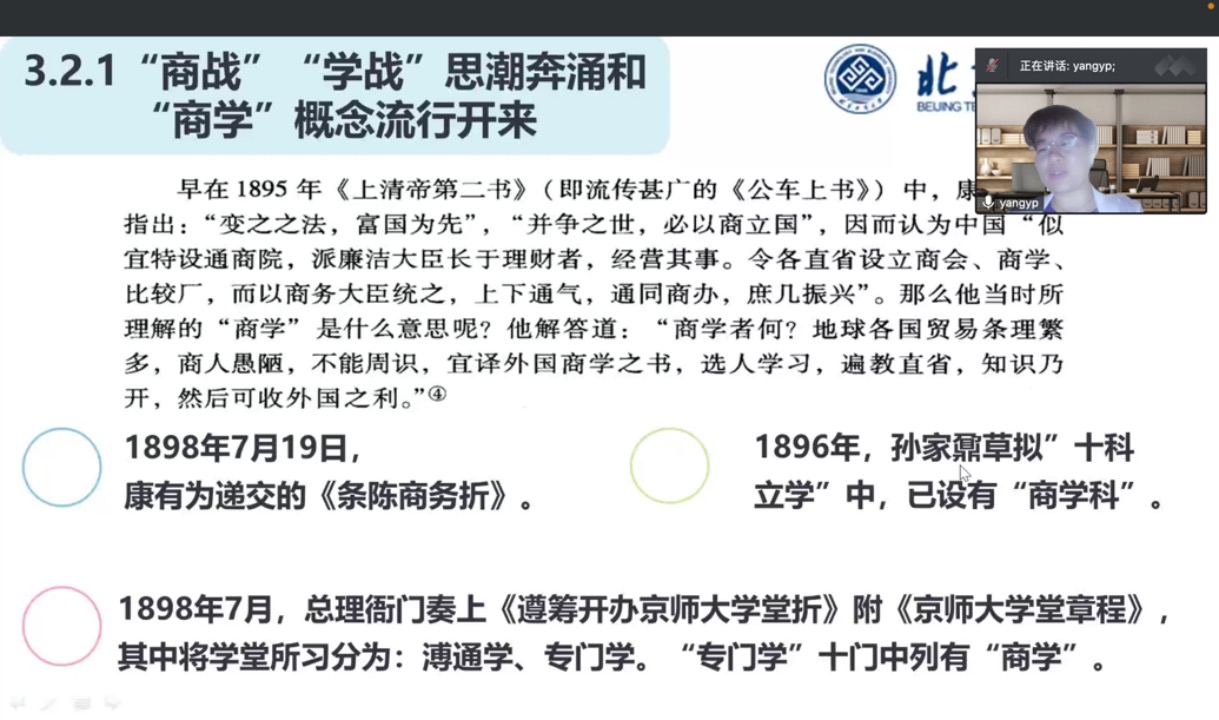 在近两个小时的时间里,杨艳萍博士从社会史、思想史和学术史相结合的角度,在商务类报刊、商学类译著、教科书以及相关档案等丰富史料的基础上,全面讲解了近代中国商学的兴起和发展。她以“商”字的由来作为切入点,系统梳理了“商学”从引进到本土化的历程及其启示,并对近代商学的历史内涵、学科体系构建和走向社会化进行了重点解读。杨艳萍博士认为近代“商学”经由不断的内涵演变,最终形成了以“商业经济学”为核心,包括商业地理学、商业历史学、商品学等众多相关分支学科在内的一门综合型学科。通过揭示“商学”的兴起与清末民初学术现代转型的联系,进一步分析了其对于丰富近现代中国学术转型等问题的重要意义。最后,杨艳萍博士指出,厘清我国商学学科从引进、传播到自觉构建知识体系的发展脉络,将有助于以近代学术和社会转型的图景,为当下构建商学自主知识体系提供历史借鉴。
