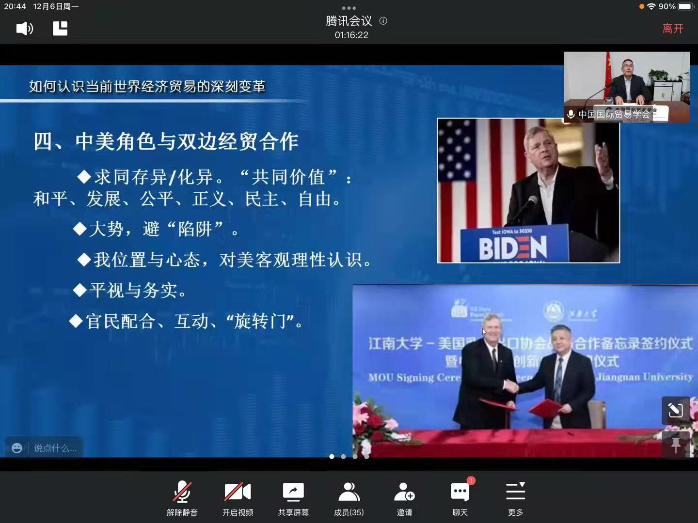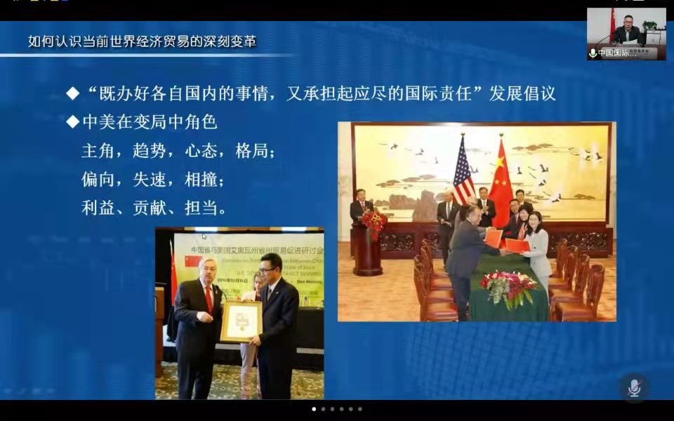 边振瑚认为,中国的发展模式为各个国家提供了不同的发展样本,工业化、城镇化、现代化、信息化并存的多样性发展为大变局中的其他国家走出困境提供了可以期待的借鉴,中国一直秉持既办好各自国内的事情,又承担起应尽的国际责任的发展倡议。当前,我们需要深思如何看待变局中的中美角色与双边经贸合作,我们需要理性、平和、坚定不移地走自己的路,面对相向而行的大国要力争管控好分歧、管控好竞争。美国的经济表现相对衰弱,但还没有影响其国际地位,它在国际经贸中的作用不会被轻易替代。目前世界经济的发展流通很大程度上还依赖于美国市场的开放,我们应当理性看待而不能轻易忽视它的市场容量,应当积极思考如何保持良好的国际竞争与合作关系。他主张两国应当求同存异或求同化异,寻求和平、发展、公平、正义等共同价值。讲座的尾声,边会长播放了美国前驻华大使泰里·布兰斯塔德在去年疫情最严重期间代表美国大豆出口协会呼吁中美大豆行业友好合作、携手共克时艰的短视频,生动展示了中美之间的利益关系以及中美关系的发展方向。世界经济贸易的深刻变局将一直持续,在这个变局中,中国既是变量本身,又应当发挥引领作用,有所作为,在变局中谋得更主动的地位。