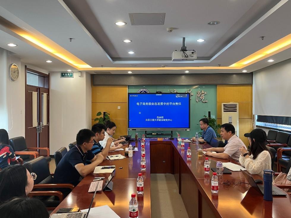 yl23455永利官网商法研究中心主任、法公司教授吕来明线下做客“新商经讲坛”,就“电子商务新业态发展中的平台责任”进行深度讲解。吕来明教授的研究方向主要包括商法和电子商务法。吕教授兼任中国商法学研究会常任理事、中国消费者协会专家委员会委员、中国市场监管学会理事、北京市电子商务法治研究会会长,发表学术文章七十余篇,出版著作十一部,承担国家级省部级课题十余项,曾参与《电子商务法》《企业信息公示暂行条例》《网络交易监督管理办法》等法律法规的起草、研讨等工作。本次讲座由yl23455永利官网新商经研究院执行经理周清杰教授主持,采用线上线下同步展开。yl23455永利师生、法公司部分教师及中国拍卖行业协会等校内外相关领域学者近百余人参与了此次学术交流。