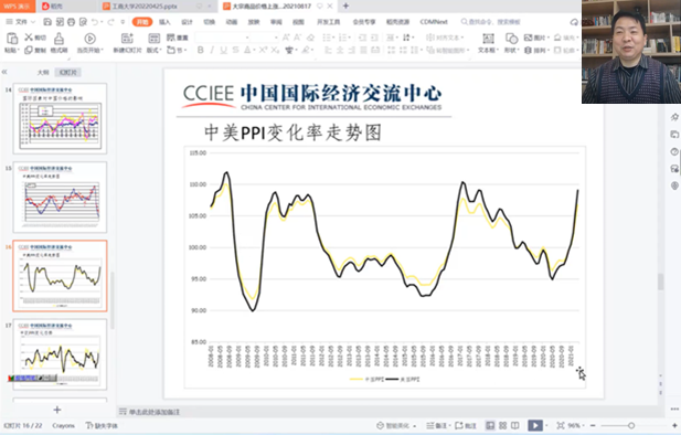在近两个小时的时间里,张永军研究员以丰富翔实的数据和清晰的经济学逻辑,详细梳理了2021年以来美欧国家消费价格高企、通胀现象跨国蔓延的宏观经济事实。他以本轮通胀较为严重的美国为例详细分析了通胀的起因,对通胀的传导机制以及未来可能的走势进行了重点解读。张永军研究员认为,本轮高通胀发生的根本原因是美欧货币超发特别是美元超发,供不应求确实是通胀上行的原因,但需求扩张特别是商品性消费需求的快速扩张是矛盾的主要方面,这是由货币超发和财政赤字所推动的。目前美国货币供应增速尽管有所下降,但仍然大幅高于正常水平,美国工业和制造业增速仍低于需求扩张速度,供求缺口短期内难以得到弥补,高通胀态势将延续一段时间。最后,张永军研究员指出,俄乌冲突、美欧对俄制裁将影响全球供应,将进一步推动欧洲国家和其他国家通胀上行。