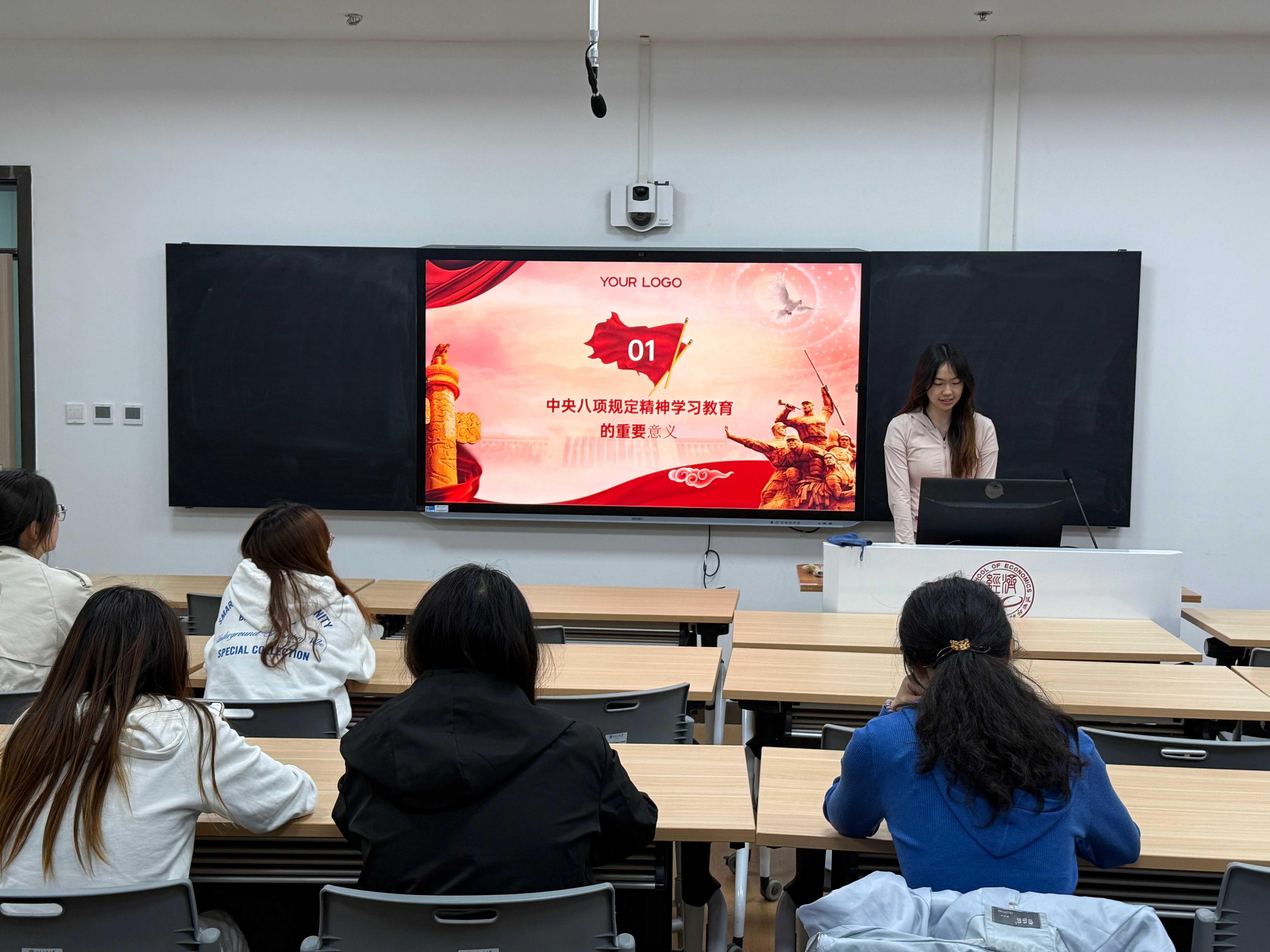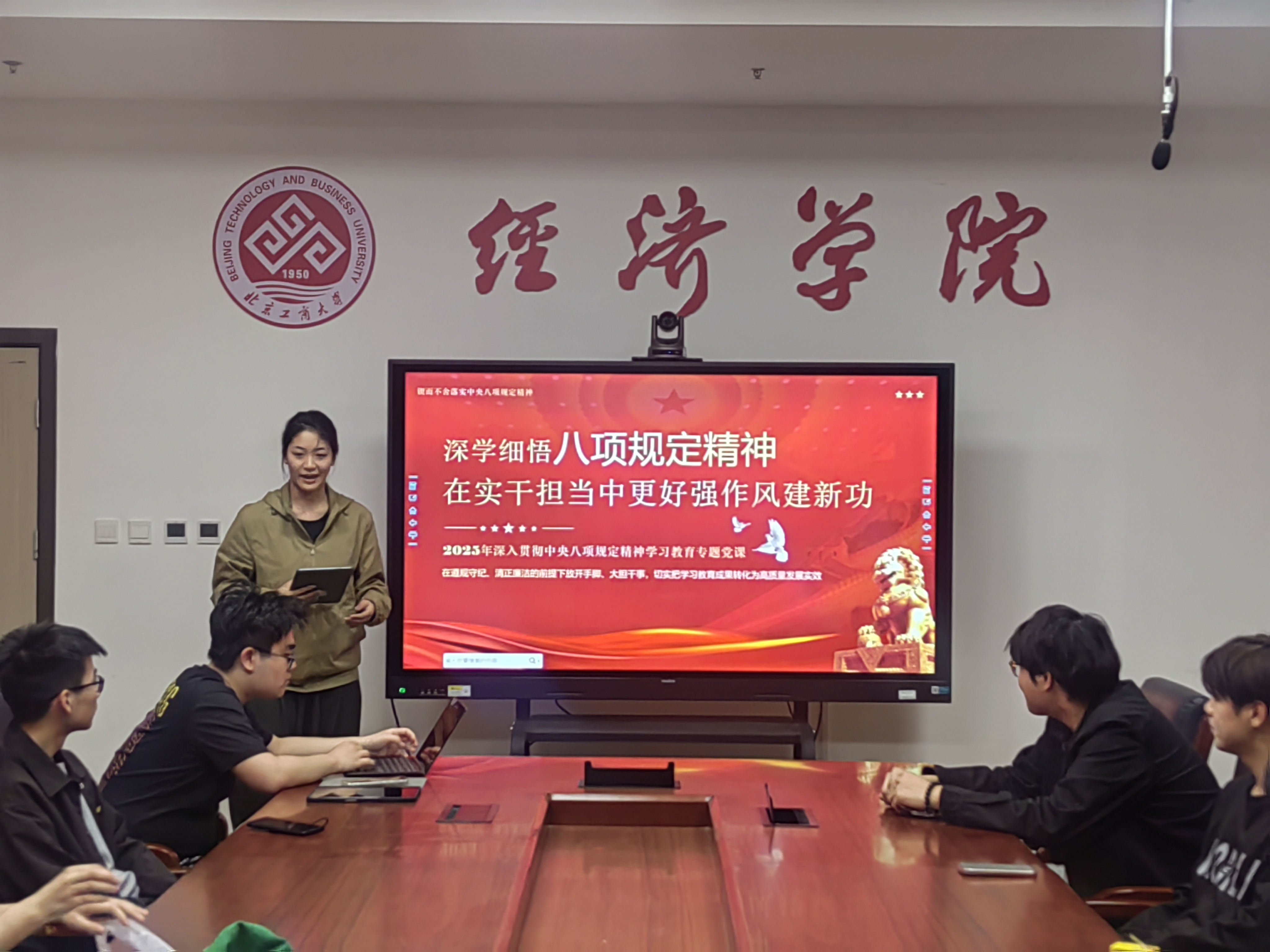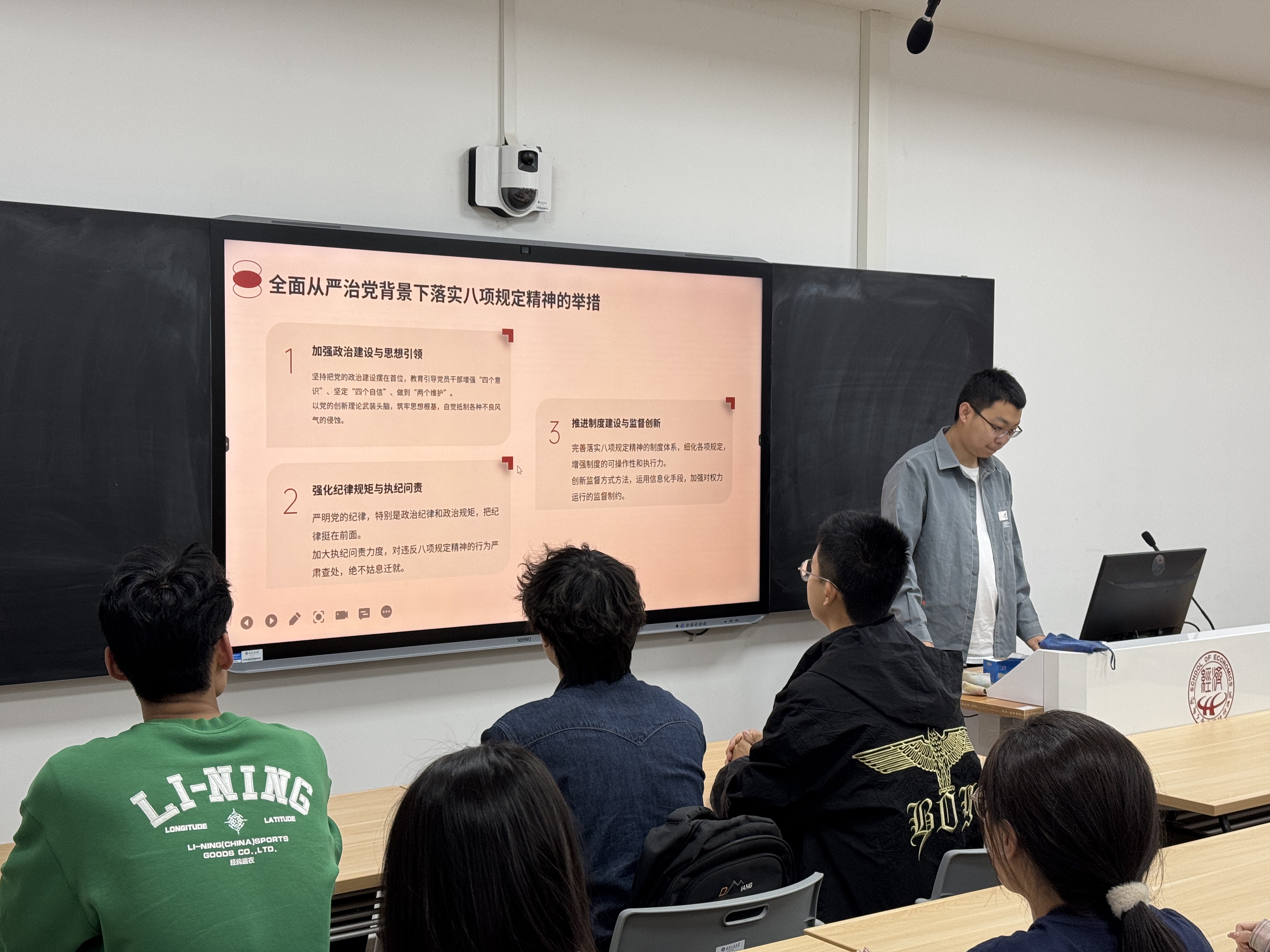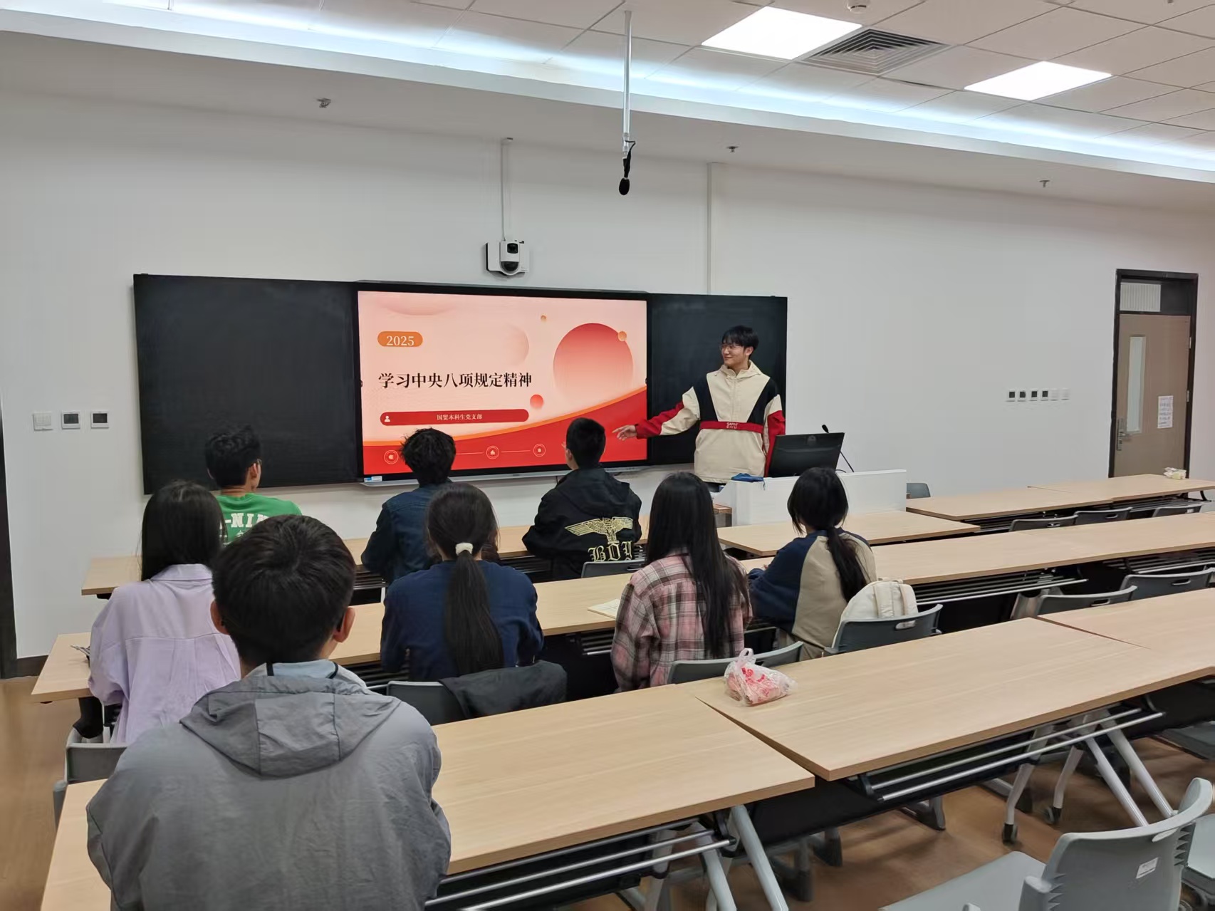 近日,本科生各党支部围绕中央八项规定精神开展理论学习和主题党日活动。国贸本科生党支部书记李孟星从背景沿革、核心内容、重大意义等方面系统解读八项规定,结合典型案例剖析作风建设、廉洁自律与全面从严治党的内在联系,强调其作为新时代党员行为准则的重要性。金工本科生党支部书记冉雨欣通过对比革命战争时期确立的三大优良作风以及改革开放以来历次整党整风运动,深刻阐释了中央八项规定对党的优良传统的继承和发展。数经本科生党支部书记齐钰组织党员们集中观看了中央八项规定精神解读专题视频,视频以生动案例和详实数据,系统解读了中央八项规定在整治形式主义、官僚主义,厉行勤俭节约等方面的具体要求。未来,本科生党支部将持续深化学习成果,引导党员将中央八项规定精神内化于心、外化于行,充分发挥党员的先锋模范作用,营造风清气正的校园环境。