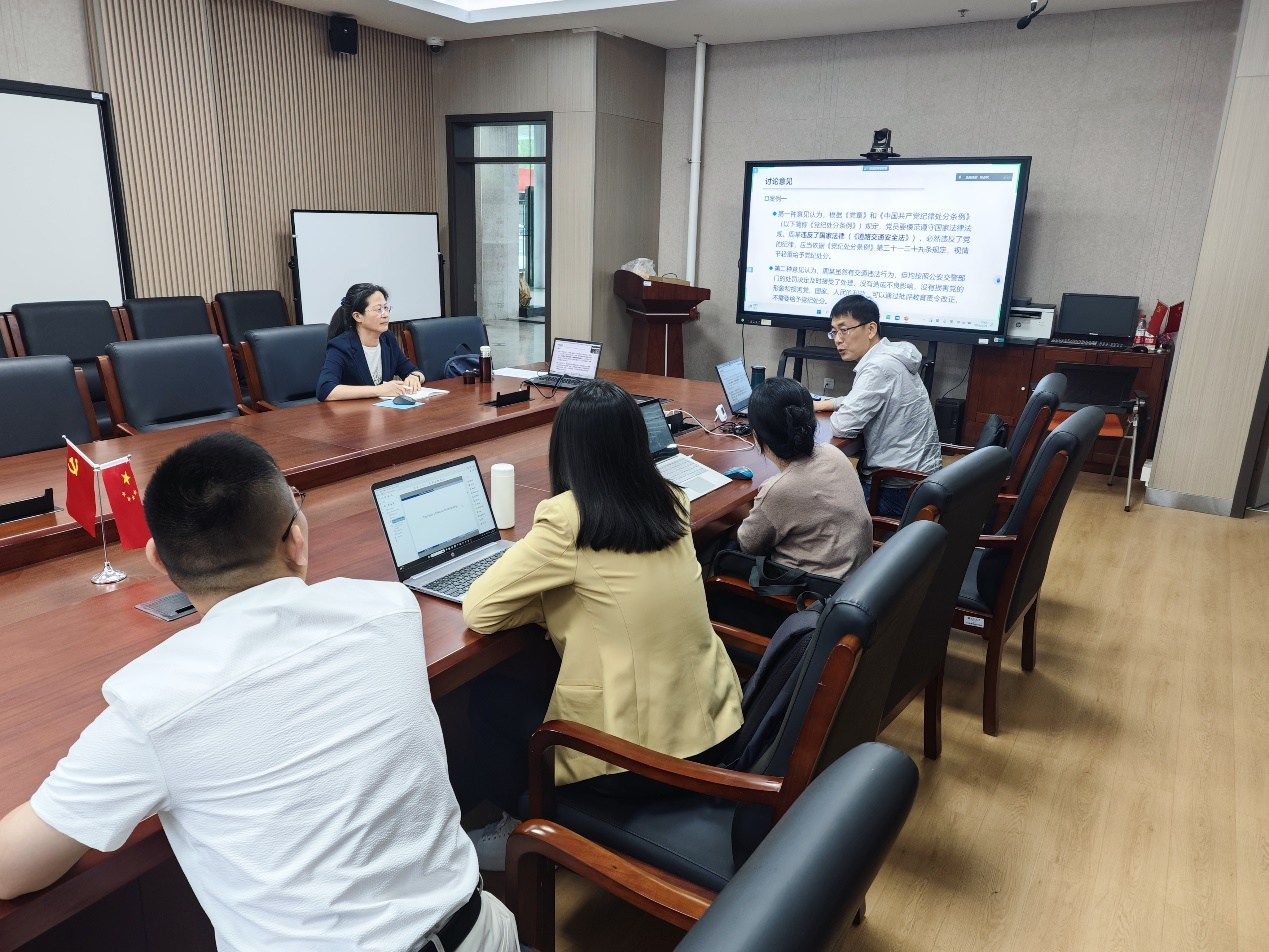 随后,进行了五月份党支部理论学习,由宋占军老师以《党员干部交通违法行为与党的纪律处分》为题进行了汇报。宋老师首先介绍了2024年实施的《中国共产党纪律处分条例》的基本框架,并详细解读了条例修订的主要变化。在此基础上,宋老师结合党员干部违章停车、驾驶证被扣期间驾车发生交通事故、触犯交通肇事罪、醉酒驾车的四个典型案例,给出了处理相应案件的不同意见。通过对这些案例的分析,全体教师认识到,实践中对轻微交通违法行为一般采取批评教育,交通违法行为不涉及犯罪但受到较重行政处罚的应当给予党纪处分,交通违法行为涉嫌犯罪的应当区分情形给予相应的党纪处分直至开除党籍。