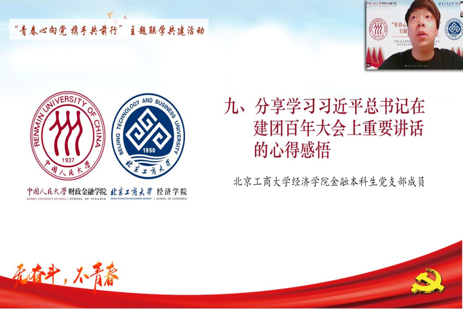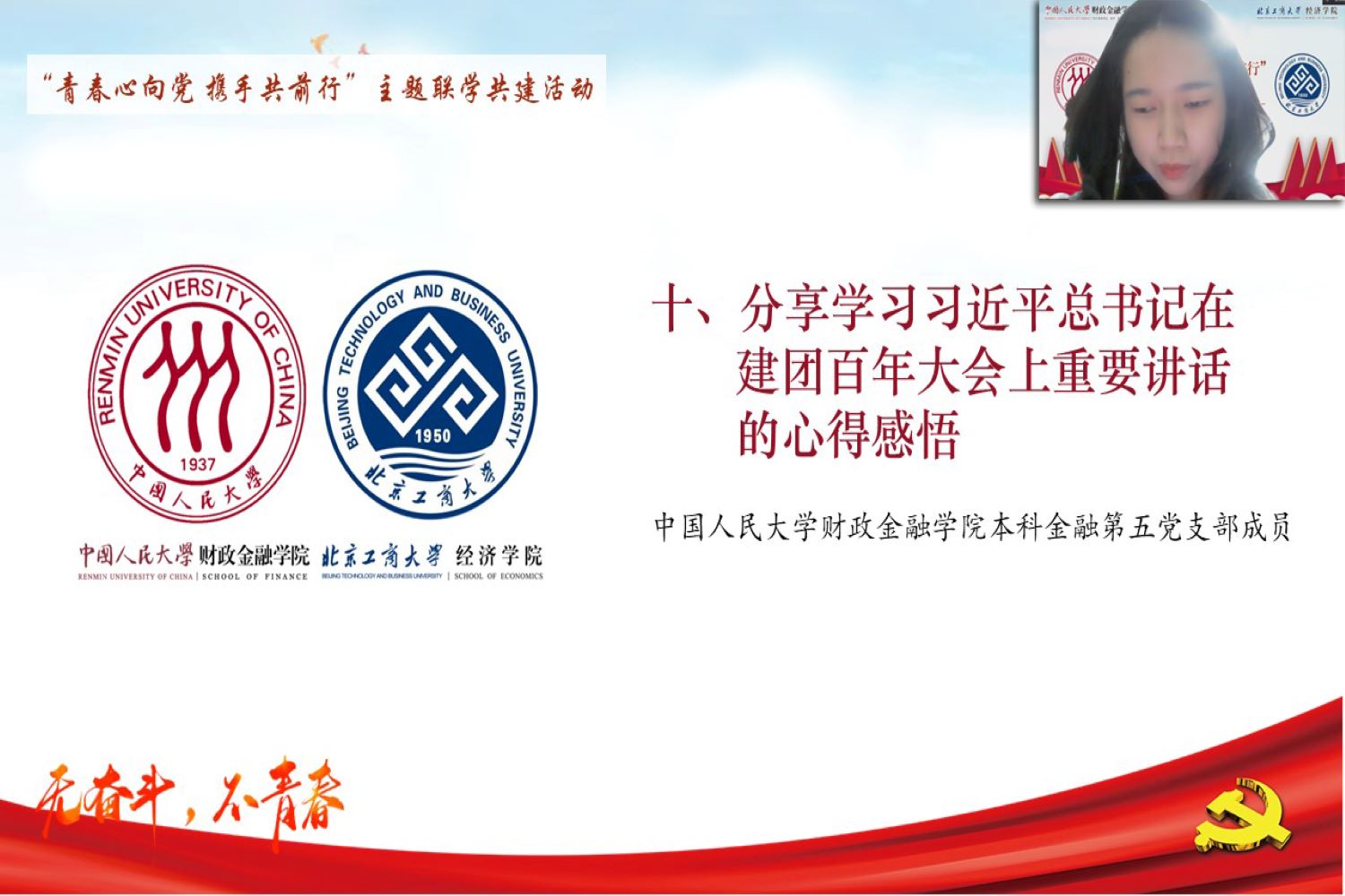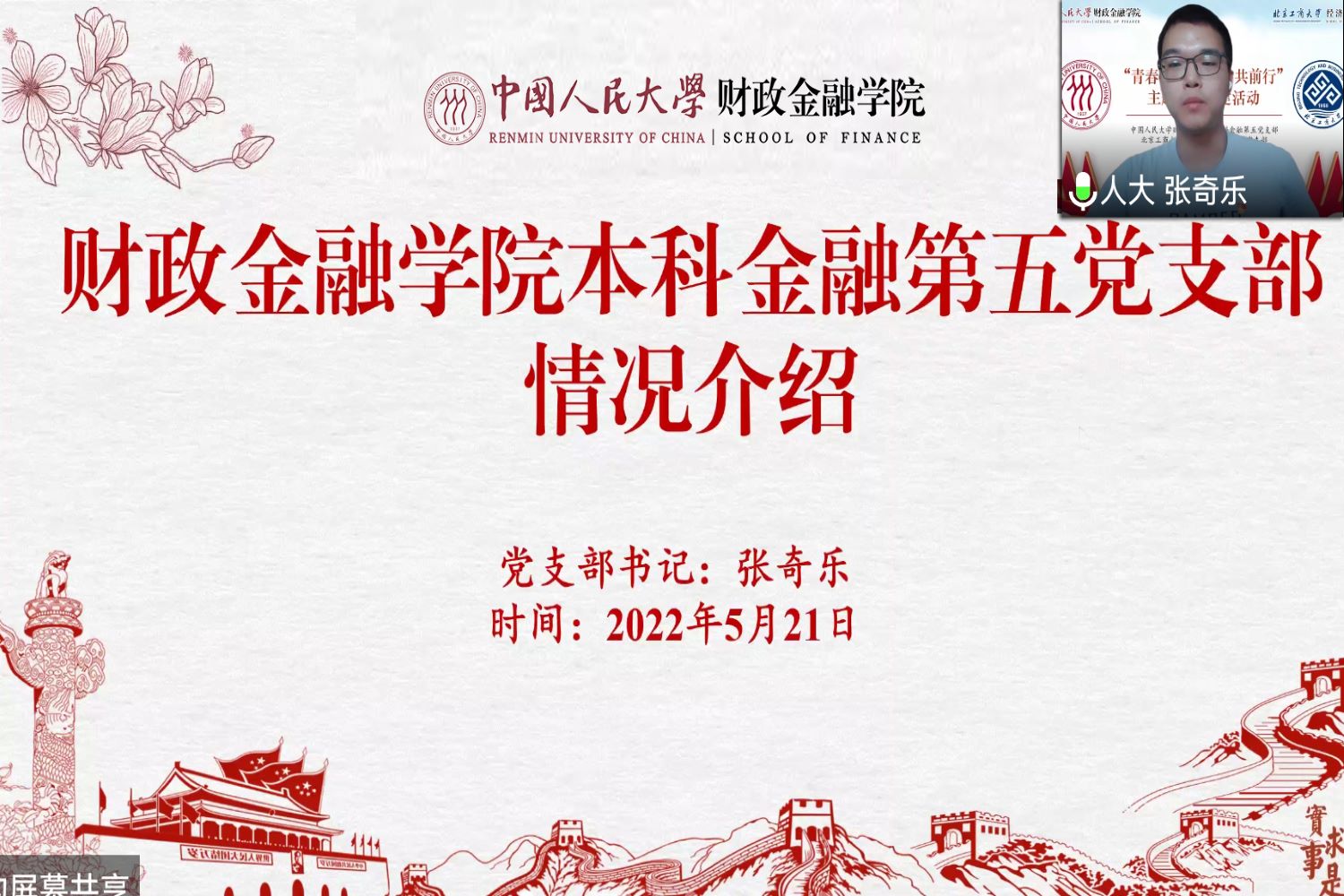 为深入学习贯彻习近平新时代中国特色社会主义思想,深化校际间党支部的学习与交流,提升党支部政治功能和组织力,公司yl23455永利金融本科生党支部同中国人民大学财政金融公司本科生金融第五党支部,于2022年5月21日14:30开展“青春心向党 携手共前行”主题联学共建活动。