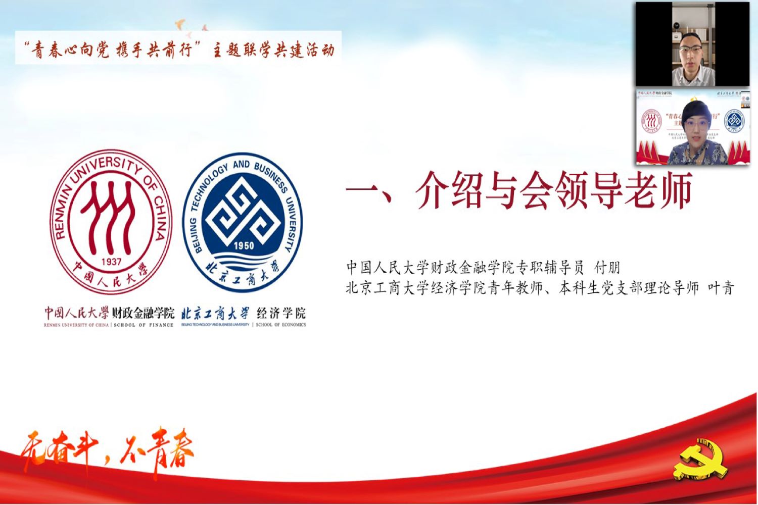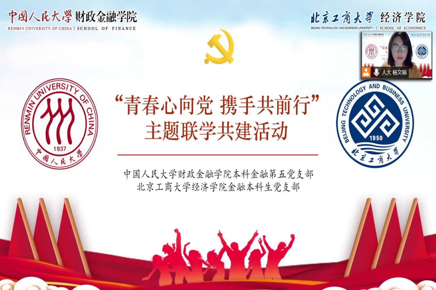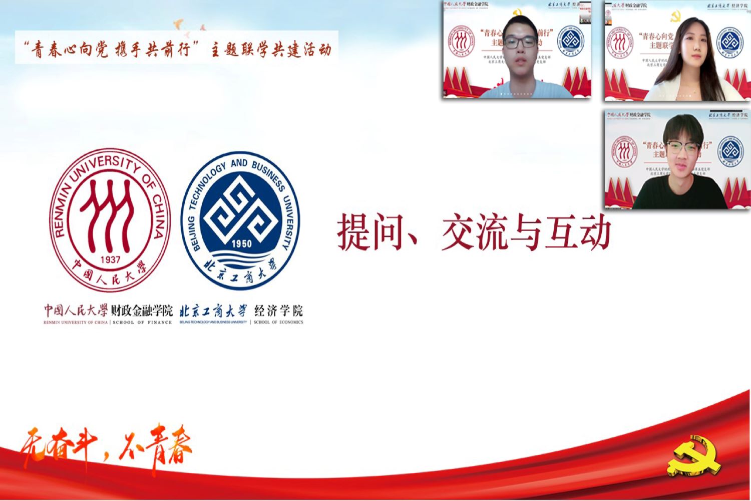 为深入学习贯彻习近平新时代中国特色社会主义思想,深化校际间党支部的学习与交流,提升党支部政治功能和组织力,公司yl23455永利金融本科生党支部同中国人民大学财政金融公司本科生金融第五党支部,于2022年5月21日14:30开展“青春心向党 携手共前行”主题联学共建活动。