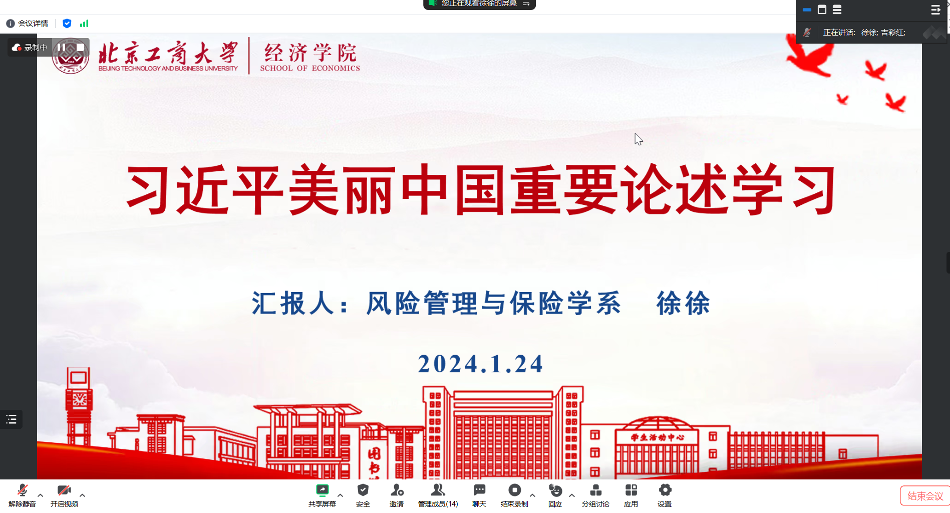1月24日晚19:30,保险系教师党支部通过腾讯会议形式开展一月份理论学习会,党支部书记吉彩红老师主持会议。