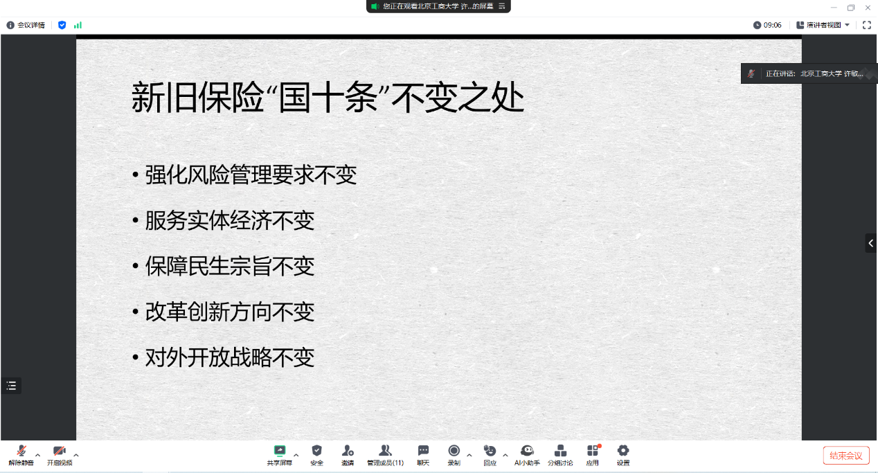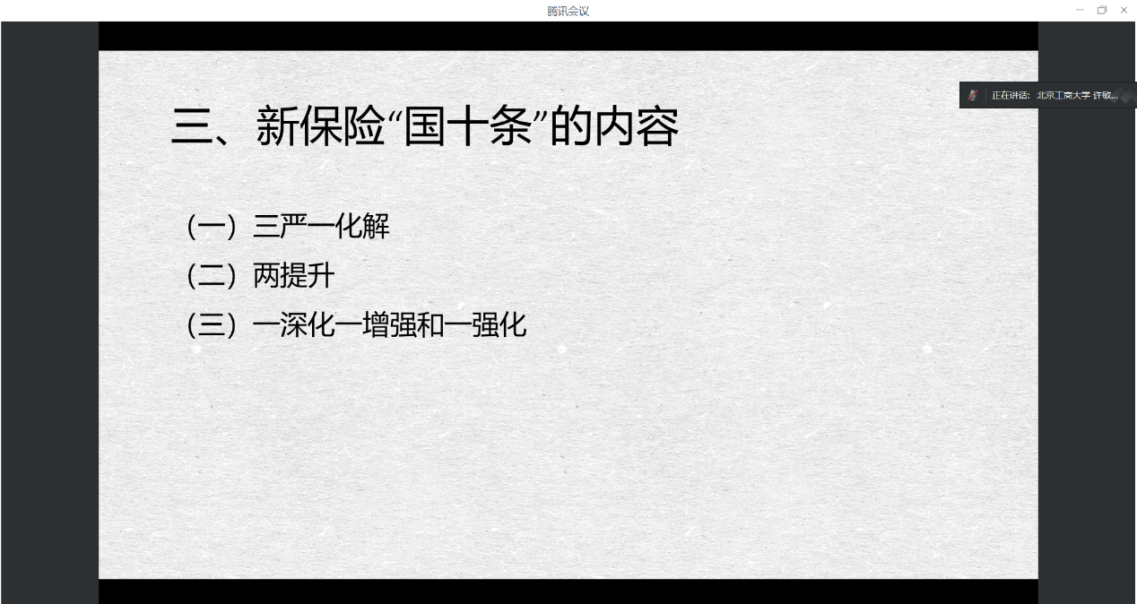 许老师进一步分析了保险新“国十条”的核心内容:“三严一化解”、两提升、一深化、一增强和一强化的战略措施。她的解读帮助大家加深了对政策的理解,理清了当前保险行业监管与发展方向的关键思路。