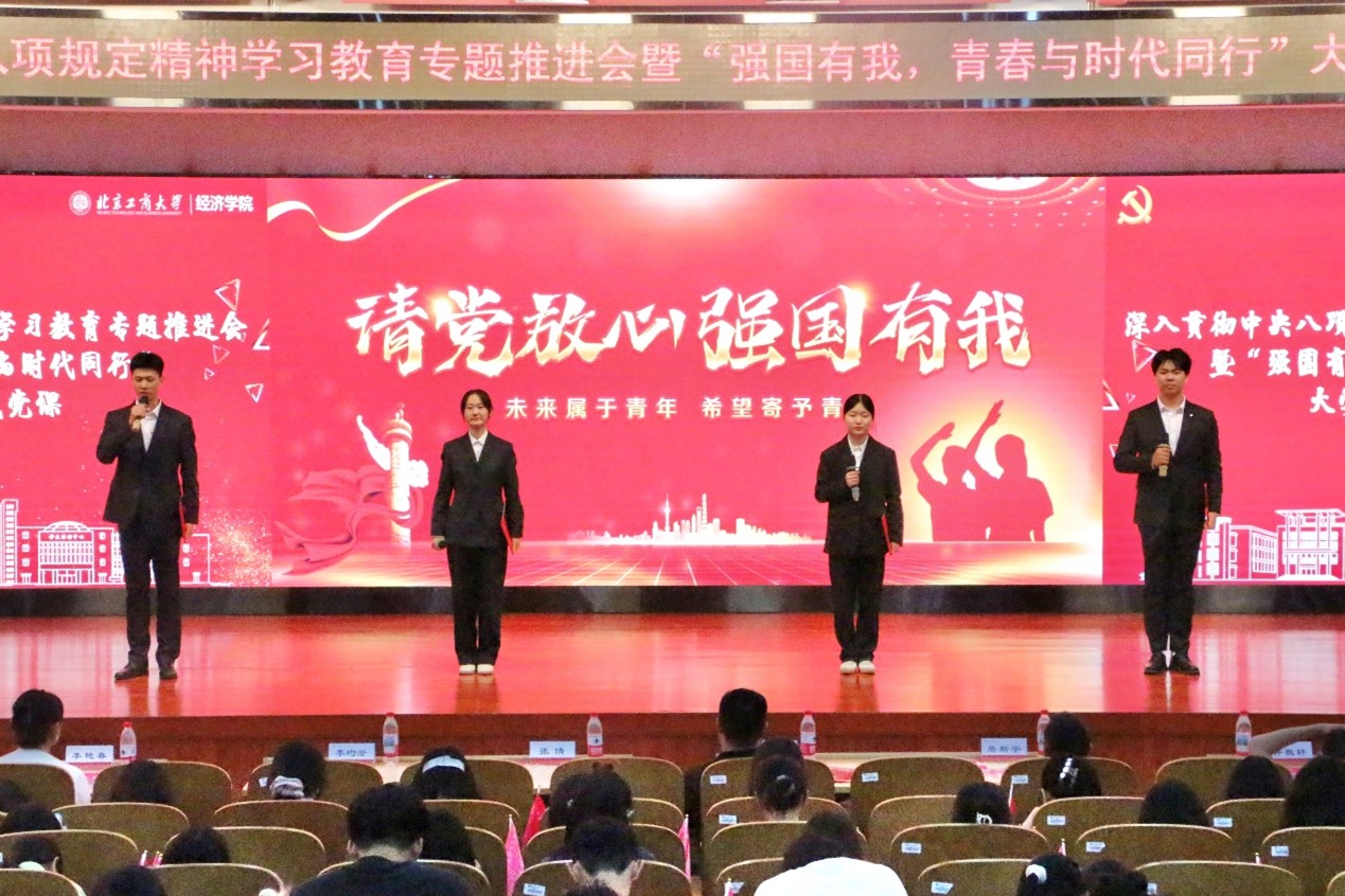 诗朗诵《论文写在祖国大地上》激昂响起,通过朗诵者饱满的情感,让经院学子感受到一代又一代科研工作者、建设者扎根祖国大地,将自己的智慧与汗水挥洒在每一寸土地上的奋斗精神和奉献精神。他们不畏艰难险阻,在各自的领域默默耕耘,用一篇篇扎实的“论文”,为祖国的发展添砖加瓦。