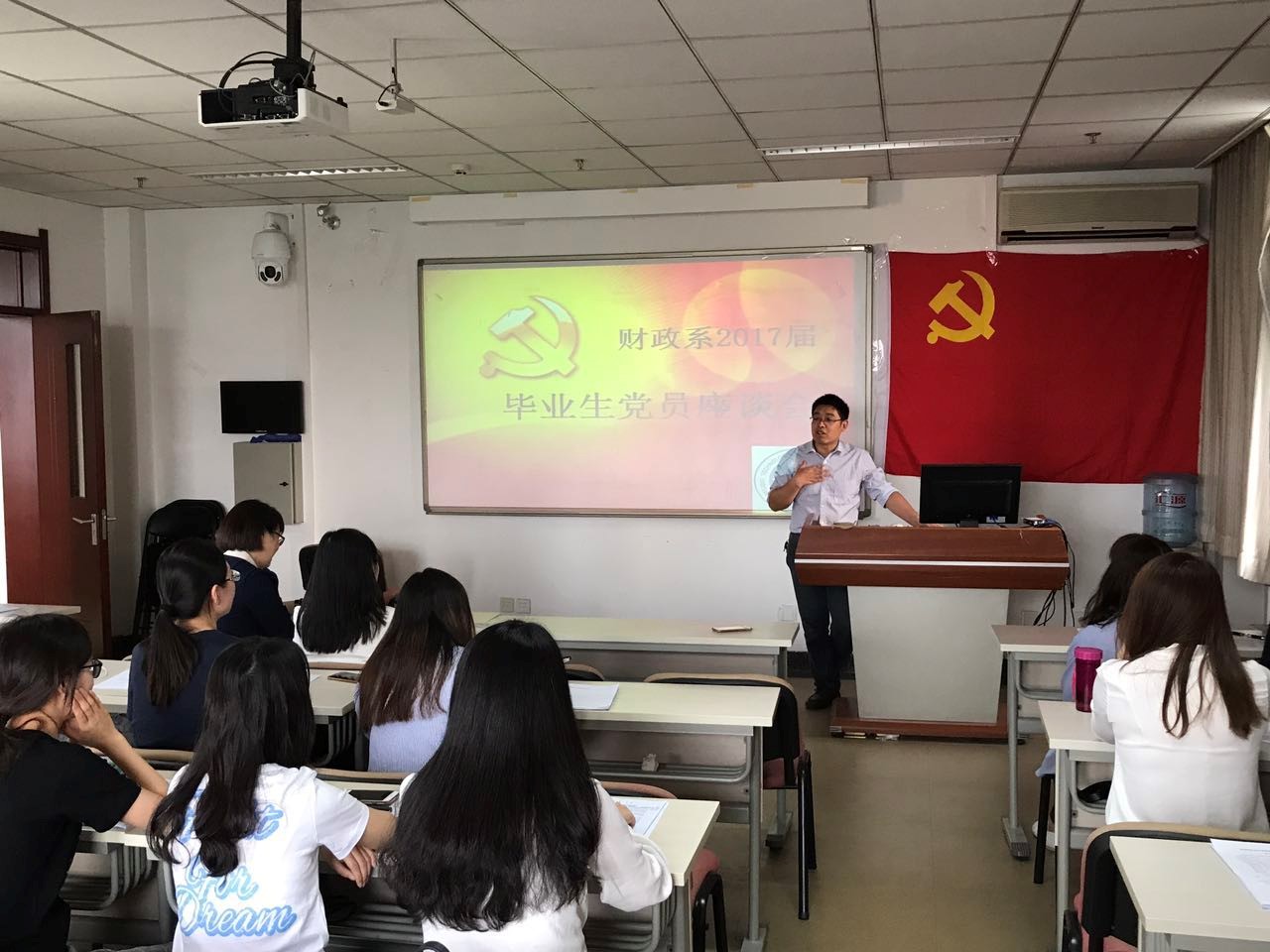 会议最后,财政系党员老师带领同学们在党旗下,重温入党宣誓的庄严时刻,希望大家能够不忘初心,牢记党员使命。