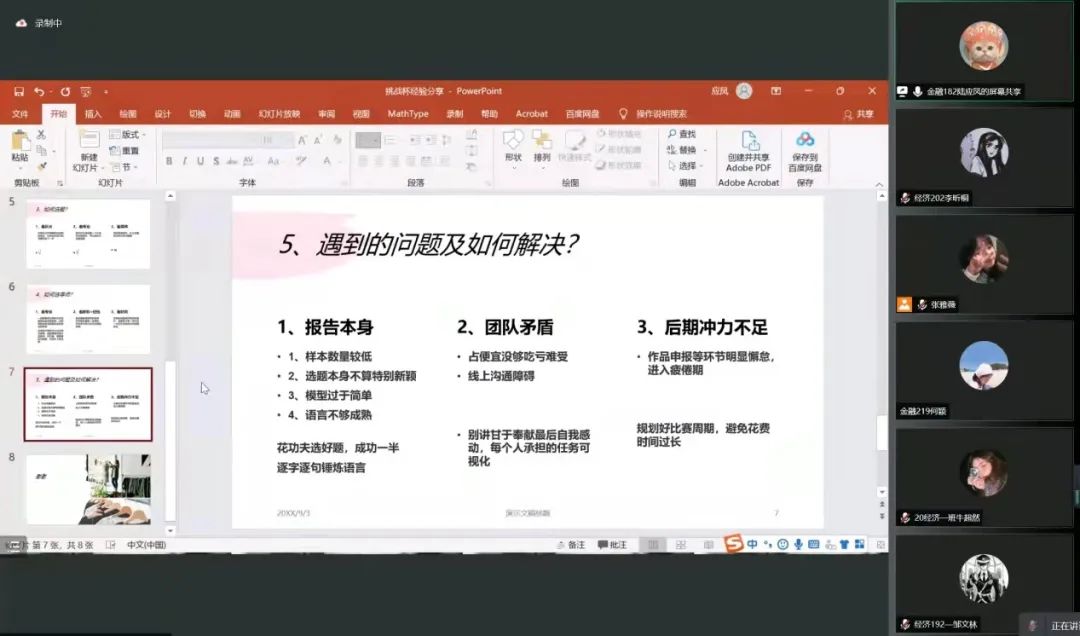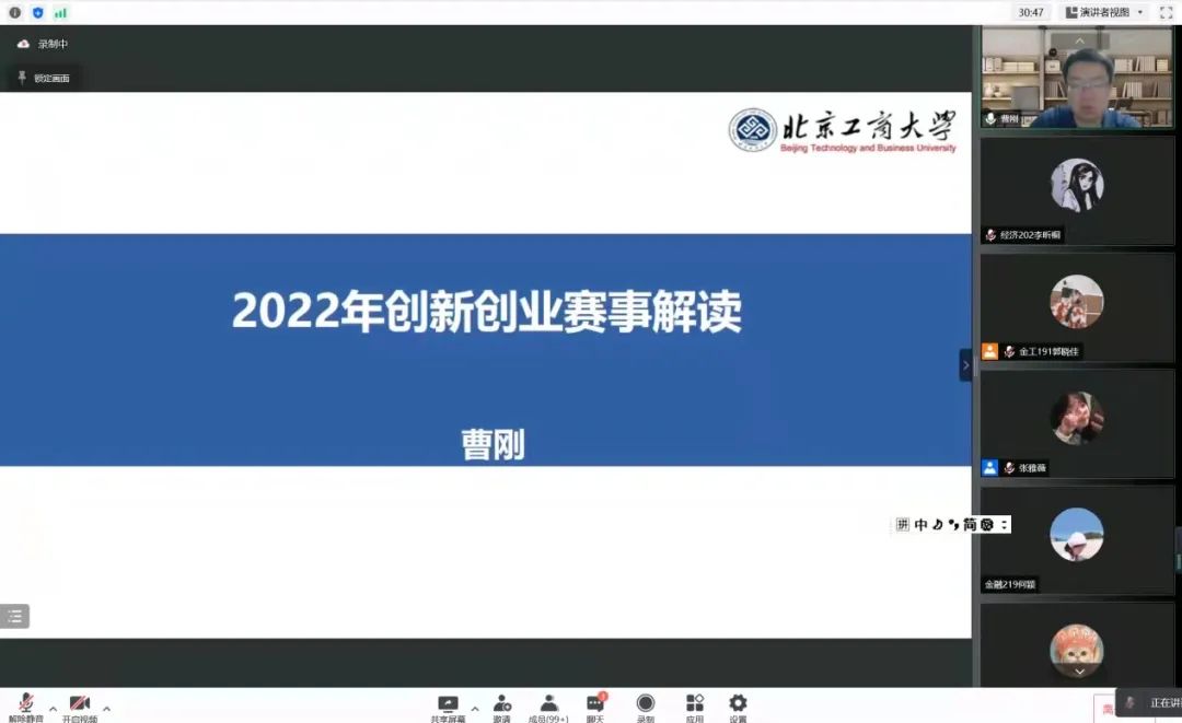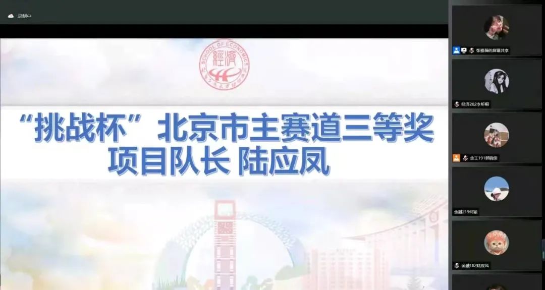 接着,2021年“挑战杯”北京市主赛道三等奖项目队长陆应凤同学就所参加的“大挑”赛事进行了说明,并结合自己的参赛获奖经验就如何组队、如何选题、如何选导师等关注度较高问题作出了分享。她还鼓励同学们努力学习专业知识,厚积薄发,为今后参加创新创业大赛打下扎实的理论基础。
