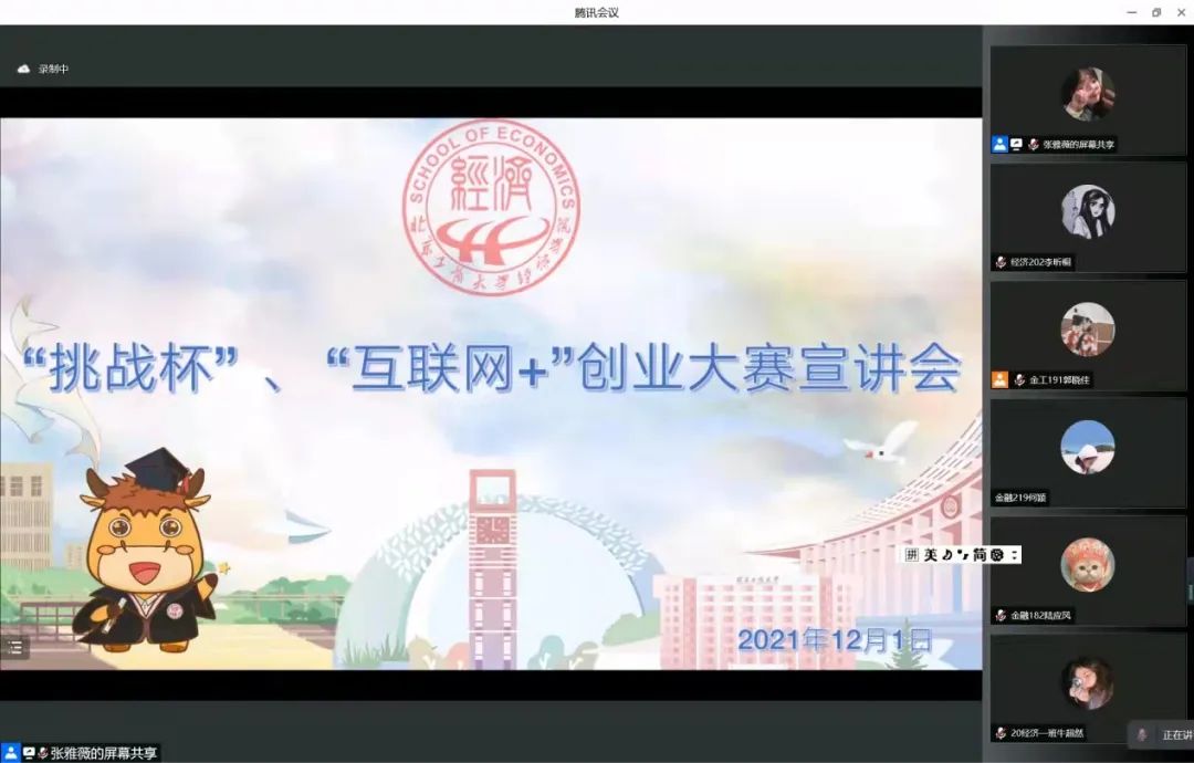 为培养公司员工科创精神,加深同学们对“挑战杯”和“互联网+”竞赛的了解,激发员工参与创新创业比赛的积极性,yl23455永利于2021年12月1日晚顺利举行了“经华杯”学术节第二讲——“挑战杯”、“互联网+”创业大赛线上宣讲会。参加此次会议的有贸经系副主任曹刚老师、18级陆应凤同学及140余名员工代表。会议由辅导员王婷老师主持。