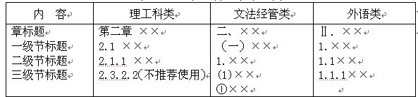(四)论文正文分章节撰写,各章标题要突出重点、简明扼要。字数一般在15字以内,不得使用标点符号,层次以少为宜,具体要求见下表: