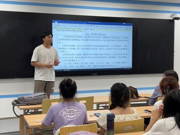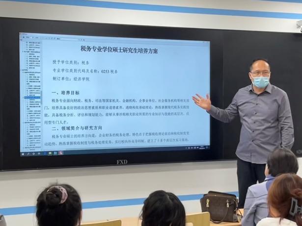 接下来,财政系副主任贾建宇老师对公司产品方案以及双选方案进行了详细的说明,贾老师敦促同学们要关注培养方案当中的具体内容,对自己研究生的整体学习生涯要有清晰的规划,在遇到问题时及时向老师求助,财政系的全体老师始终都会耐心帮助同学们,为同学们的学习与实践提供多种资源和机会。