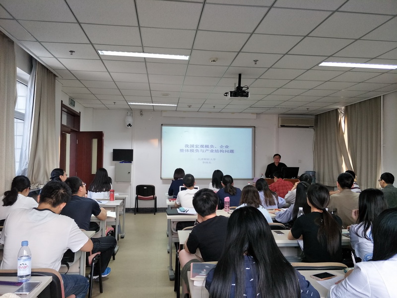 李炜光教授先是深入浅出地以“以色列国王-公民-税收”的故事引出本次讲座主题,然后就“宏观税负的概念和测算方法”“如何测度我国企业整体税负”“社保缴费的税收性质探讨”“企业税负对产业结构的影响及其行业分布”等十个问题提出了他的独特见解。针对目前财税学者对于宏观税负理解有分歧、使用方法和口径不一致问题,李教授提出我国的宏观税负主要是政府收入占GDP或国民收入比重以及宏观税负只适应于“大口径”或广义范围的计算等独特观点。此外,他以美国特朗普抛出的一系列大幅度减税计划为导引提出了全球税收革命等观点,并结合统计数据探讨了预算收入-预算支出-税收的平衡机制,最后李教授结合实际提出了“继续适当降低五险一金有关缴费比例”、“重点降低占税收收入过半的非公经济税费负担”等4条降低宏观税负的具体途径,使老师和同学们受益匪浅。