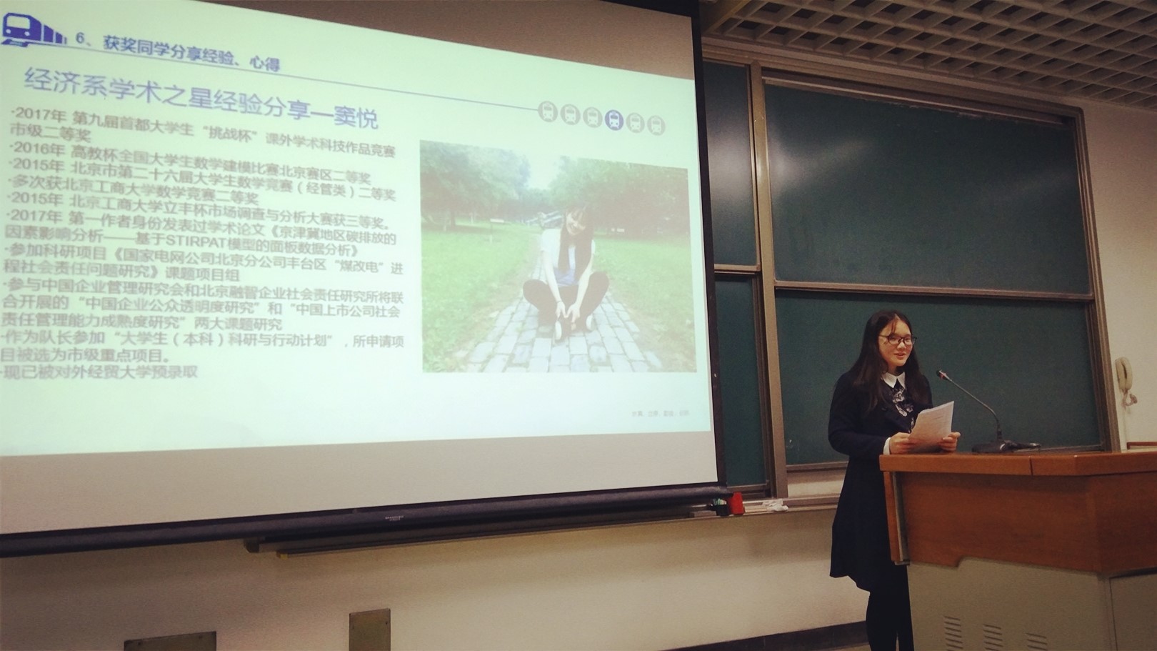 经济14班的窦悦作为学术之星代表为大家梳理了自己大学四年的历程,轻松的心态是她达到优秀学术成果的源泉,在演讲时,她透漏出别样的自信,她还希望经济系的所有员工敢于尝试,不要畏难。经济15班的赵玮玥作为学习进步奖代表,经济14李莹作为学术优秀奖代表进行演讲。他们都提到了自己曾经在学习中的失误,并通过自我调整状态获得进步。他们希望学弟学妹不要放弃自己,不要在意别人的眼中自己有多不济,自己永远有机会成为最棒的人。