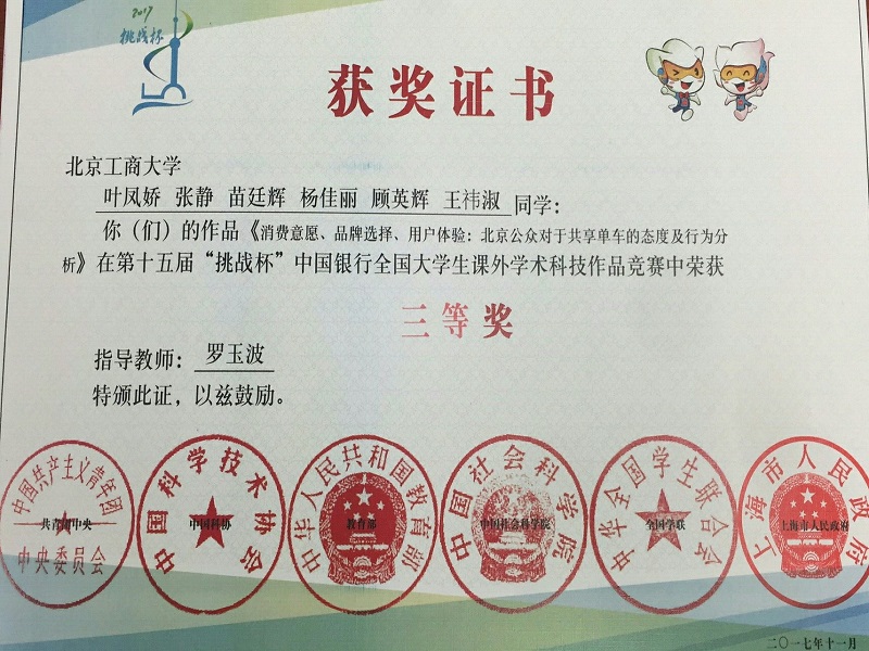 11月14日至18日,由共青团中央、中国科协、教育部、中国社会科公司、全国学联和上海市人民政府共同主办,上海大学承办的第十五届“挑战杯”全国老员工课外学术科技作品竞赛终审决赛举行。罗玉波老师指导的参赛作品《消费意愿、品牌选择、用户体验—北京社会公众对于共享单车的态度及行为分析》进入全国终审决赛。经过作品展示、专家质询、现场答辩、评委会审议等环节,荣获全国三等奖。这是公司参赛队首次闯入“挑战杯”全国终审决赛并获奖。