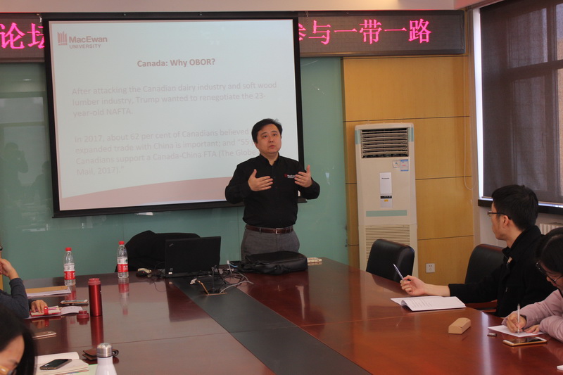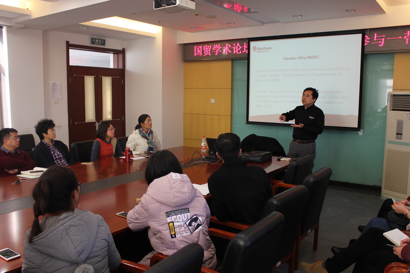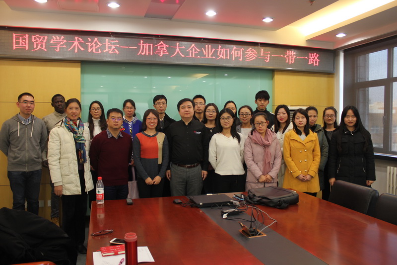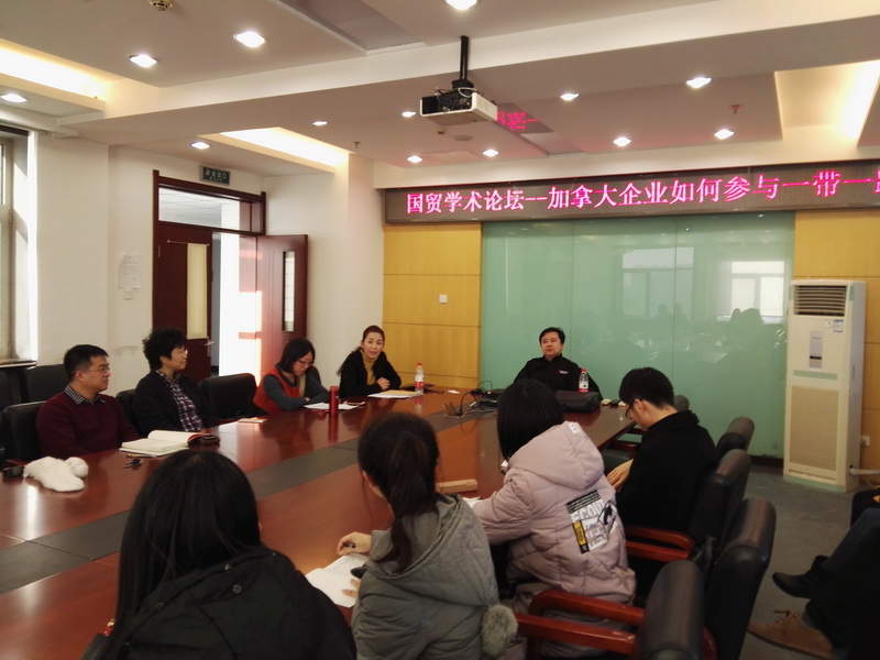 1213日下午两点,国贸系在综合楼801举办了国贸学术论坛第一期活动,邀请到加拿大阿尔伯塔省公立麦科文大学商公司副经理魏小军教授做学术讲座,主题是“加拿大企业如何参与一带一路”。yl23455永利经理徐丹丹教授参加了活动,国贸教研室主任朱振荣副教授、郭毅教授、潘忠副教授及国际贸易学与国际商务研究生20余人参加了讲座,本次活动由郭志超副教授主持。
