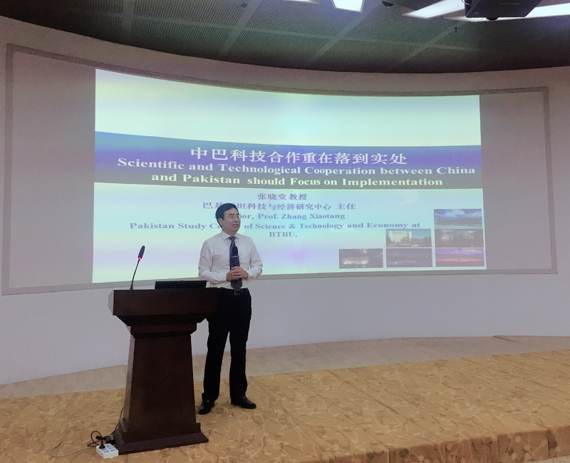 巴斯坦科技与经济研究中心主任张晓堂教授在发言阶段发表了题为“中巴科技合作重在落到实处”的主题演讲。张教授向与会嘉宾简要介绍了中心成立的背景、发展目标和特色活动,并详细阐述了中巴合作的良好基础、广阔空间和未来方向等重要内容。中心成员朱振荣副教授、郑兰平副教授、邸玉娜副教授等一同受邀出席此次会议。