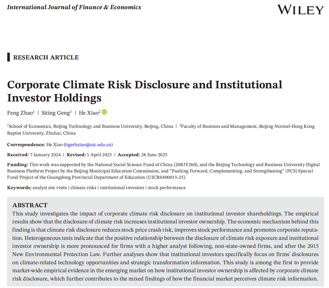 本研究探讨了企业气候风险信息披露对机构投资者持股比例的影响。实证结果表明,气候风险信息披露能提升机构投资者持股比例。这一发现背后的经济机制在于:气候风险信息披露可降低股价暴跌风险、改善股票表现并提升企业声誉。异质性检验显示,对于拥有更多分析师关注的企业、非国有企业以及2015年《新环境保护法》实施后的企业,气候风险敞口披露与机构投资者持股比例之间的正向关系更为显著。进一步分析表明,机构投资者特别关注企业关于气候相关技术机遇和战略转型的信息披露。本研究是新兴市场中首批通过全市场实证证据揭示机构投资者持股如何受气候风险信息披露影响的研究之一,这进一步解释了金融市场对气候风险信息认知存在差异的原因。