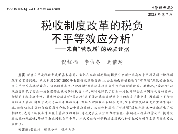 论文标题:税收制度改革的税负不平等效应分析——来自“营改增”的经验证据