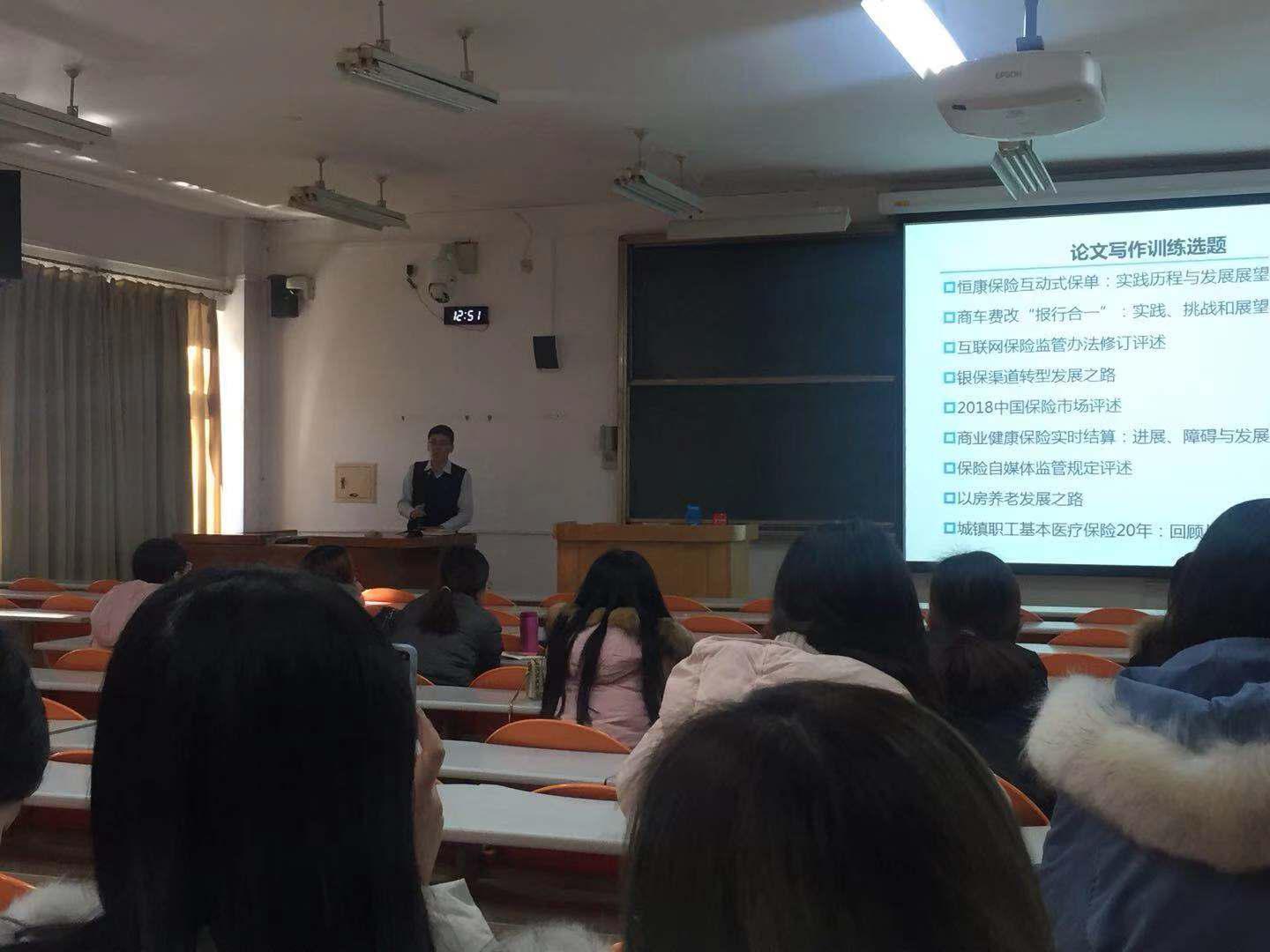 在毕业论文方面,宋老师从备题、选题、系统、注意事项和范文推荐五个方面介绍了毕业论文各环节的主要工作,要求各位同学重视毕业论文的写作训练。宋老师以一篇论文摘要举例,讲解论文写作过程中可能出现的表述、逻辑和专业知识等方面的问题。近期保险市场热点话题纷呈,各位同学均可以作为毕业论文的选题方向。