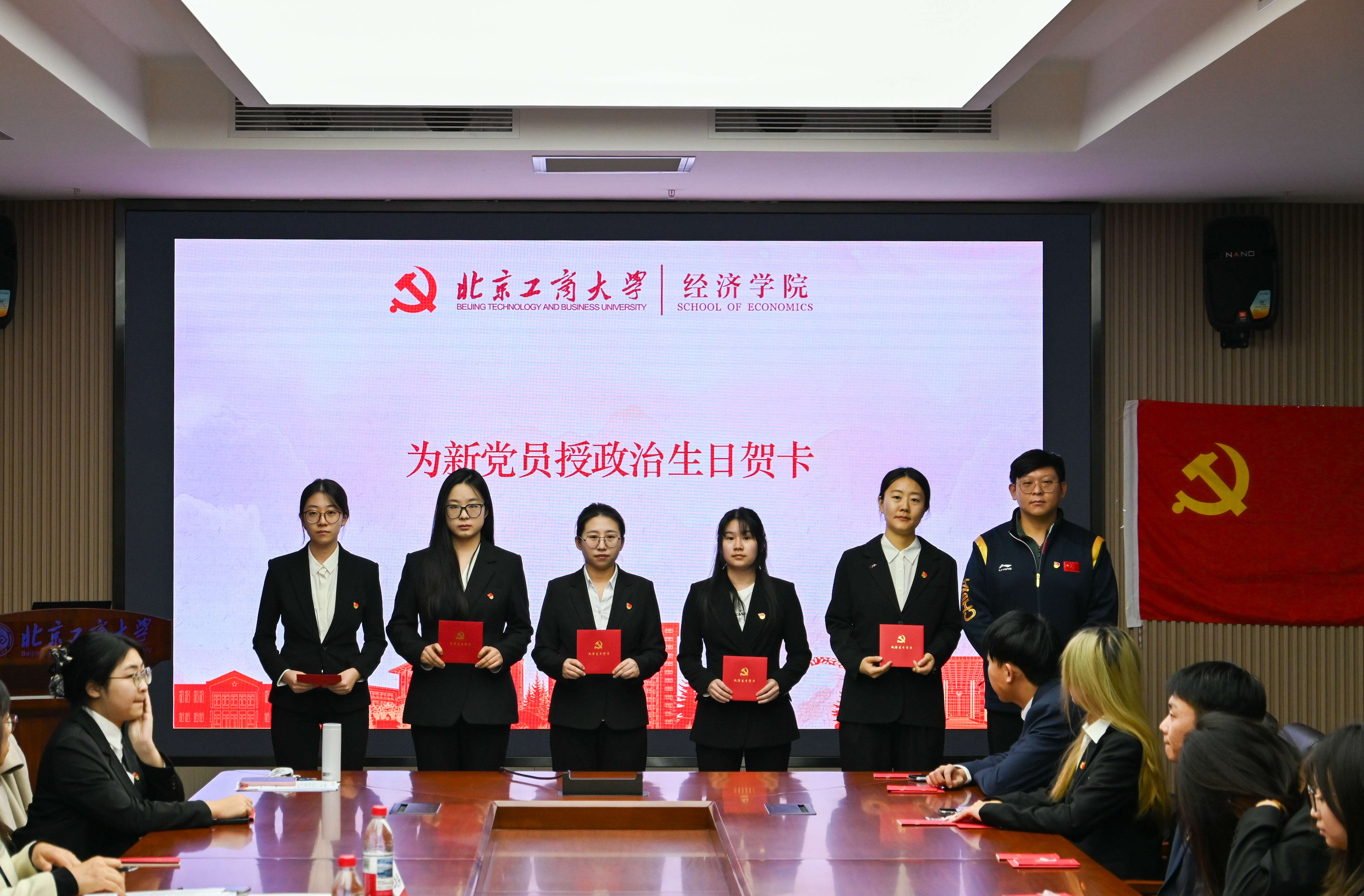 专职组织员柳金龙为新党员代表授政治生日贺卡。