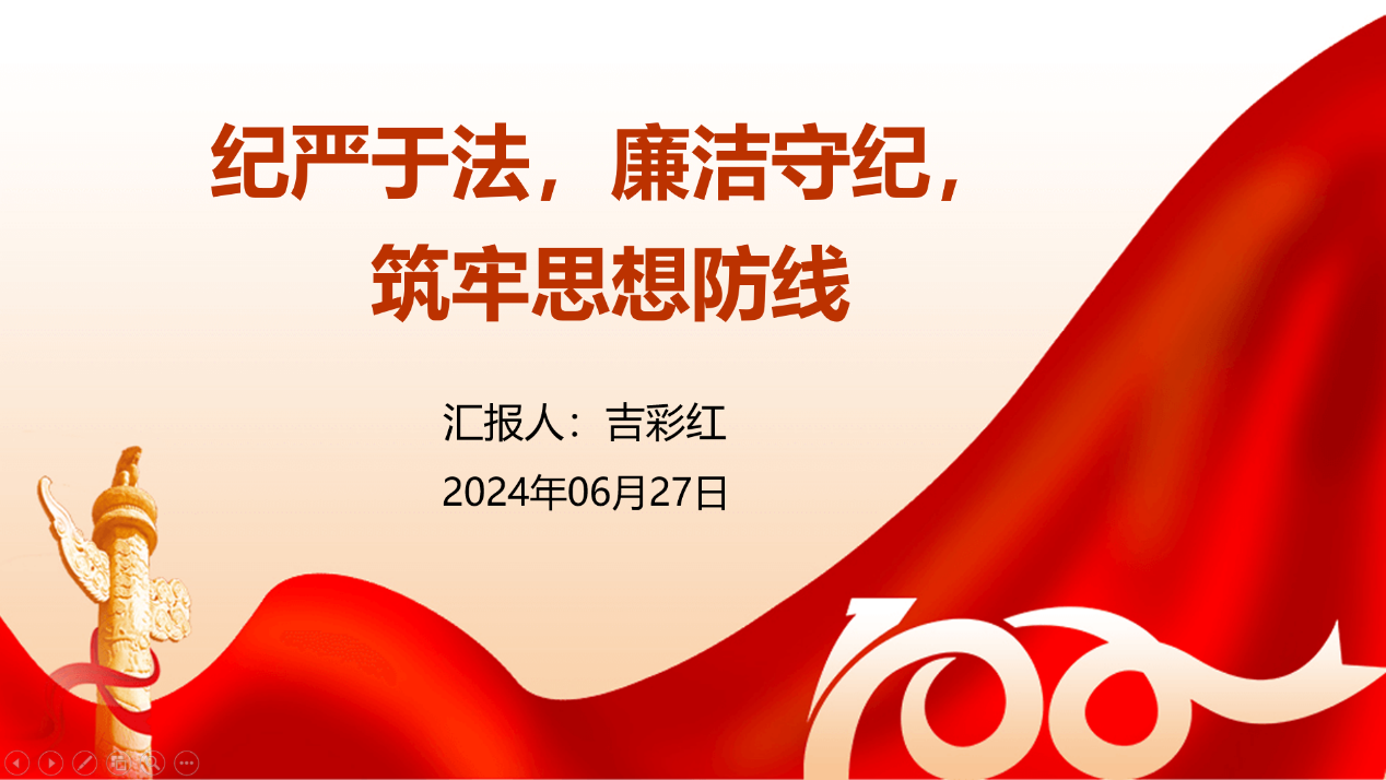 首先,吉彩红老师讲授了题为“纪严于法,廉洁守纪,筑牢思想防线”的主题党课,从纪严于法,纪法贯通;纪法分开,纪在法前;案例警示,防微杜渐;廉洁守纪,砥砺前行四个方面展开。吉老师讲述了党的形象、党的战斗力、党纪的先行性、党纪的试点作用、党纪的权威性等,通过观看视频、学习警示案例,告诫全体师生党员要保持高度的红线意识、廉洁自律、为国家和人民贡献力量。党课生动且深刻,引起同学们强烈的情感共鸣。