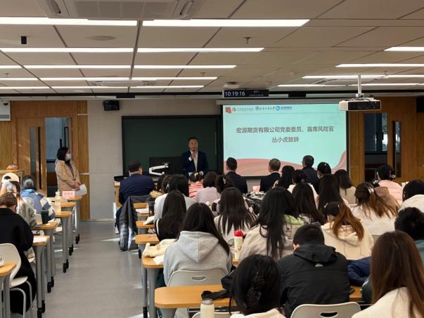 最后,宏源期货有限公司产业金融总部副总经理王潋进行了《期货价格分析——基本面分析框架》的专题讲座。内容从期货品种类型、期货价格形成机制、基本面分析框架等方面展开。王潋副总经理从宏观经济视角、供需平衡、季节性、成本利润、事件驱动等角度,结合农产品、基本金属、能源化工等具体期货品种,详细分析了影响期货价格的各种因素,并运用实例和数据,生动解读了期货价格的变动规律。王潋副总经理还介绍了多空持仓、CFTC、LME等持仓报告在期货投资中的作用。与会同学就期货公司人才发展路线等问题进行提问,王潋副总经理的耐心解答使得同学们受益匪浅。