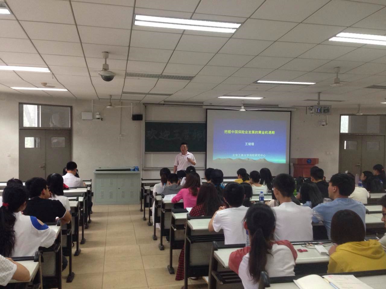 王绪瑾教授和宋占军博士分别在河北大学和河北金融公司展开宣讲,从学科优势、团队情况、招生方案、课程体系、就业情况、夏令营项目等大家关心的问题入手,详细介绍了yl23455永利和保险系的有关情况,引起了师生的极大兴趣。之后,王绪瑾教授利用两个小时的时间为河北大学yl23455永利师生做了题为《抓住中国保险业发展的黄金机遇期》的报告,从中国保险业发展的成就、面临的矛盾、机遇、发展建议四个方面展开讲述。师生们认真聆听王绪瑾教授的精彩报告,掌声热烈,认真记录,受益匪浅。
