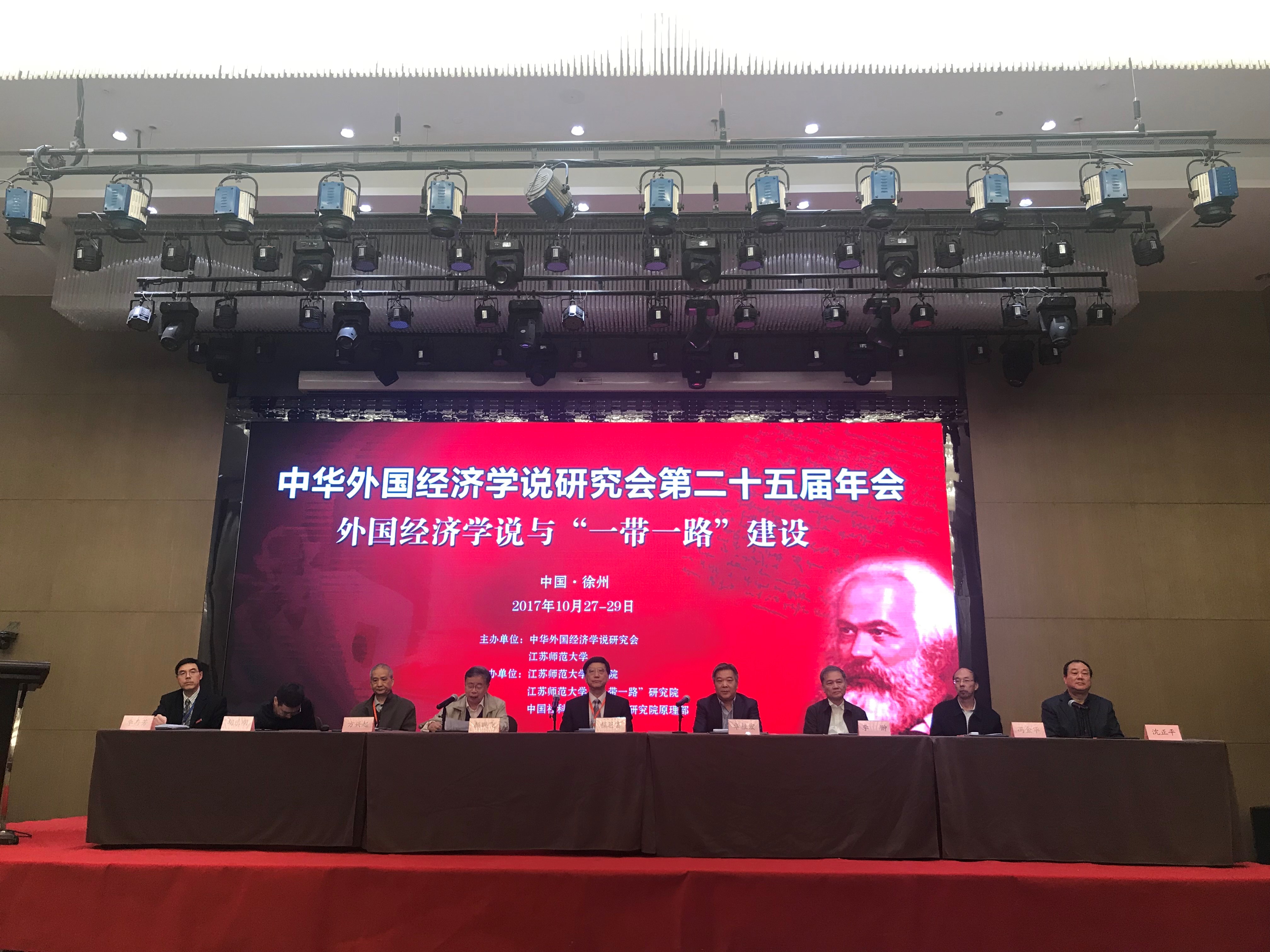 2017年10月28日-29日,中华外国经济学说研究会第25届年会在江苏徐州召开,会议由中华外国经济学说研究会与江苏师范大学主办,江苏师范大学商公司、江苏师范大学“一带一路”研究院及中国社科院马克思主义研究院原理部承办。中华外国经济学说研究会会长、中国社科院马克思主义研究学部程恩富教授,副会长、武汉大学颜鹏飞教授,副会长、北京师范大学经济与工商管理公司李翀教授,副会长、江苏师范大学党委书记华桂宏教授,副会长、广东财经大学中国特色社会主义政治经济学研究中心主任方兴起教授,副会长、上海财经大学马克思主义公司冯金华教授,副会长、中国社会科学研究院马克思主义研究院原理研究部主任胡乐明教授,以及来自全国各地的专家学者、教学科研人员等160余人参加了此次会议。公司经理徐丹丹教授、经济系副主任熊文博士等参加了这次会议。