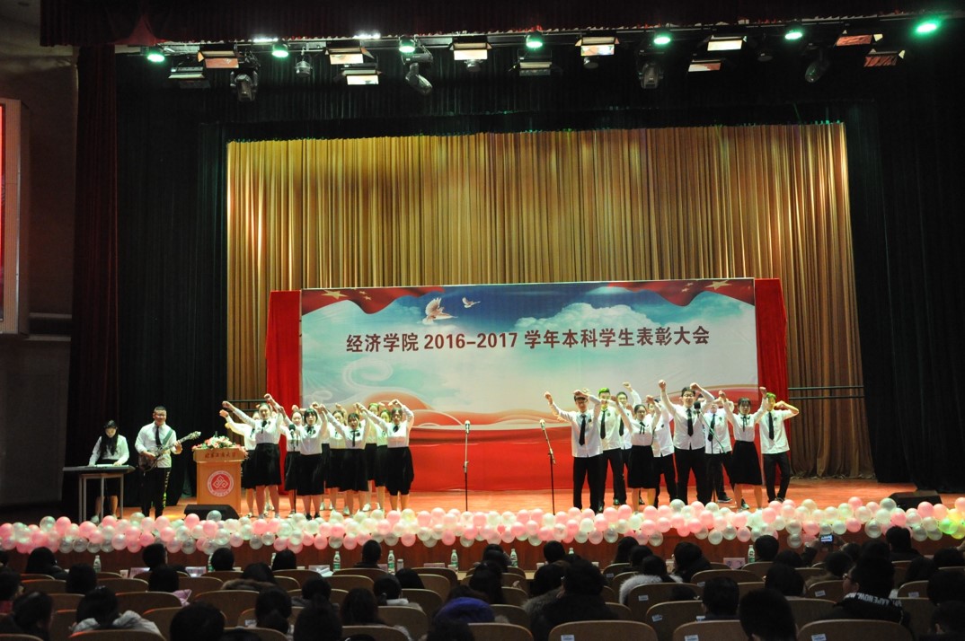 大会在青春时尚的《时间都去哪了》的开场舞中拉开了序幕,全体师生观看了2016-2017年度本科员工活动视频,回顾了过去一年公司在学术科研、党团建设、班级建设、社会实践、志愿服务、文体活动中取得的成绩。表彰大会分为市级以上、校级、院级获奖三个环节。在场师生共同观看了荣获2017年北京高校优秀员工基层组织金工151班与北京市先进班集体经济15班的获奖视频以及在市级、校级、院级取得荣誉的获奖员工风采展示。会上,员工处副处长盖晓庆、公司副经理郭馨梅、公司党委副书记杜亚辉分别宣读了市级、校级、院级的表彰决定。校员工处副处长盖晓庆为获得国家奖学金、北京高校优秀员工基层组织、市级先进班集体、市级“先锋杯”团支部、优秀团干、优秀团员的员工代表颁奖。 公司副经理张伟、副经理罗玉波、保险系主任宁威、统计系主任辛士波为校级先进班集体、优秀宿舍、校优秀员工奖学金、校三好员工、优秀员工干部、单项奖学金、军训优秀学员以及校级资助类奖项获奖同学颁奖。金融系主任李飞、财政系主任吴强、国贸系主任郑兰平、经济系副主任熊文为各级各类竞赛类奖项获奖同学颁奖。贸经系主任梁鹏、17级辅导员马腾、15级辅导员向小平、15级辅导员卫一润为经院之星、青马工程优秀学员、“五早一晚”先进个人、优秀班主任助理、优秀志愿者、院级四六级考试奖励、五四合唱先进集体与个人、优秀新闻工作者等获奖同学颁奖。