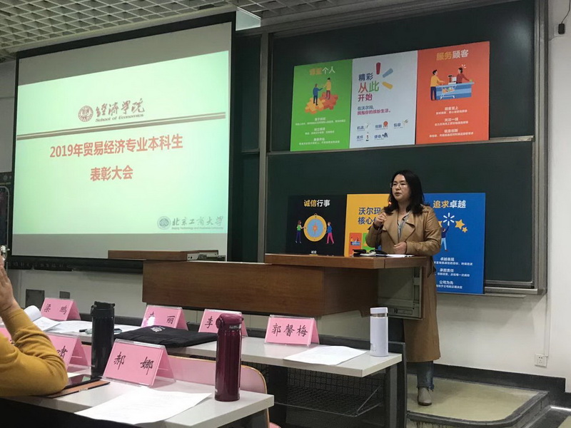 首先,李丽教授介绍本次表彰大学的筹备工作。按照公司的“三六九”培养目标详细地分析了贸易经济专业2019届毕业生的情况,指出了本专业的优势,提出了未来努力的方向,希望同学们充分认识到个人发展前景可期,要认真考虑自己的未来,提前制定规划,持续向目标努力。最后鼓励同学们珍惜北京沃尔玛百货有限公司校外实习基地的实践机会,积极参与在实践中快速成长。