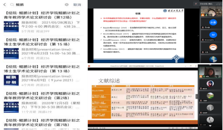 公司每两周举办一次“鲲鹏”学术论文研讨会,每次由2-3名青年教师或博士生就个人近期学术论文做主题汇报,并邀请2-3位相关领域校内外专家就汇报论文做点评分析和指导,共同就相关领域的学术前沿进行研讨。目前,“鲲鹏”计划共组织学术论文研讨会16场,公司先后共24位青年教师、8位博士生进行了学术汇报。《经济研究》《管理世界》等重要学术期刊专家学者走进研讨会与师生近距离交流。研讨会上,汇报人在专家指导下对论文进一步打磨,提升了投稿论文的成熟度。同时,其他参会师生也受益匪浅,感受到学术启发和进取动力,由此形成公司浓厚的学术氛围。