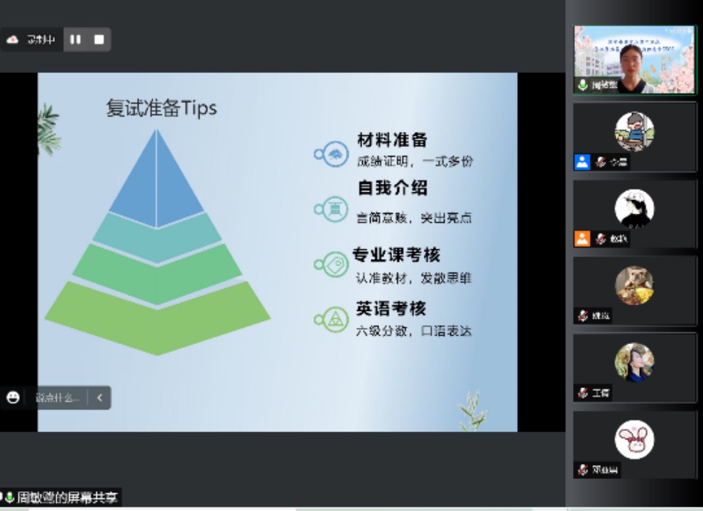 接着我系在校研究生李晨、朱又妮、姚岚、刘阳、周敏鹭五位同学从学习经历、考研备考建议、在校学习感受、实习就业经历等方面进行了毫无保留的经验分享,他们全方位的介绍为参加此次夏令营活动的同学们揭开了北工商保险系的面纱,让大家更亲切地了解到我系融洽的师生关系、浓厚的学习氛围、出众的学业表现以及优秀的就业去向。同时,我系选派部分营员的学长代表邓亚男、芦家希、吴玉茹三位同学进一步讲述选择yl23455永利官网保险专业的动机、性价比以及收获等,既为同学们备考和择校提供了有效的技巧和方法,又为同学们顺利完成此次夏令营学习提供了亲切的指导和鼓励。会议结束时营员们对此次分享活动表达了真挚的感谢!