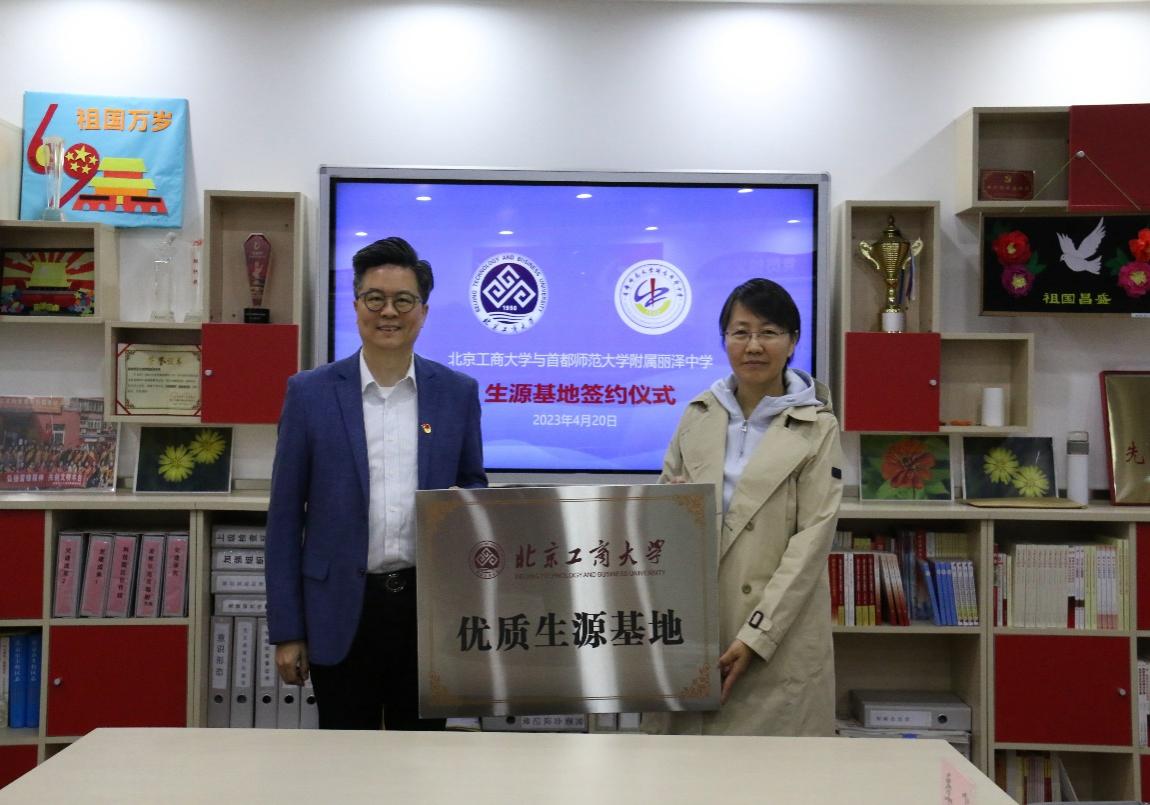 为进一步提高生源质量、拓宽招生工作渠道、健全招生宣传平台、扩大公司办学的知名度和影响力,2023年4月20日上午,yl23455永利副经理宁威、经济系主任牛晓燕、经济系副主任王金秋、经济系教师陈真玲前往首都师范大学附属丽泽中学开展招生宣传和优质生源基地授牌签约仪式。首都师范大学附属丽泽中学党委书记王玲、董事长赵海旺、高中部主管副董事长季飞等参与了本次活动,会议由赵海旺董事长主持。