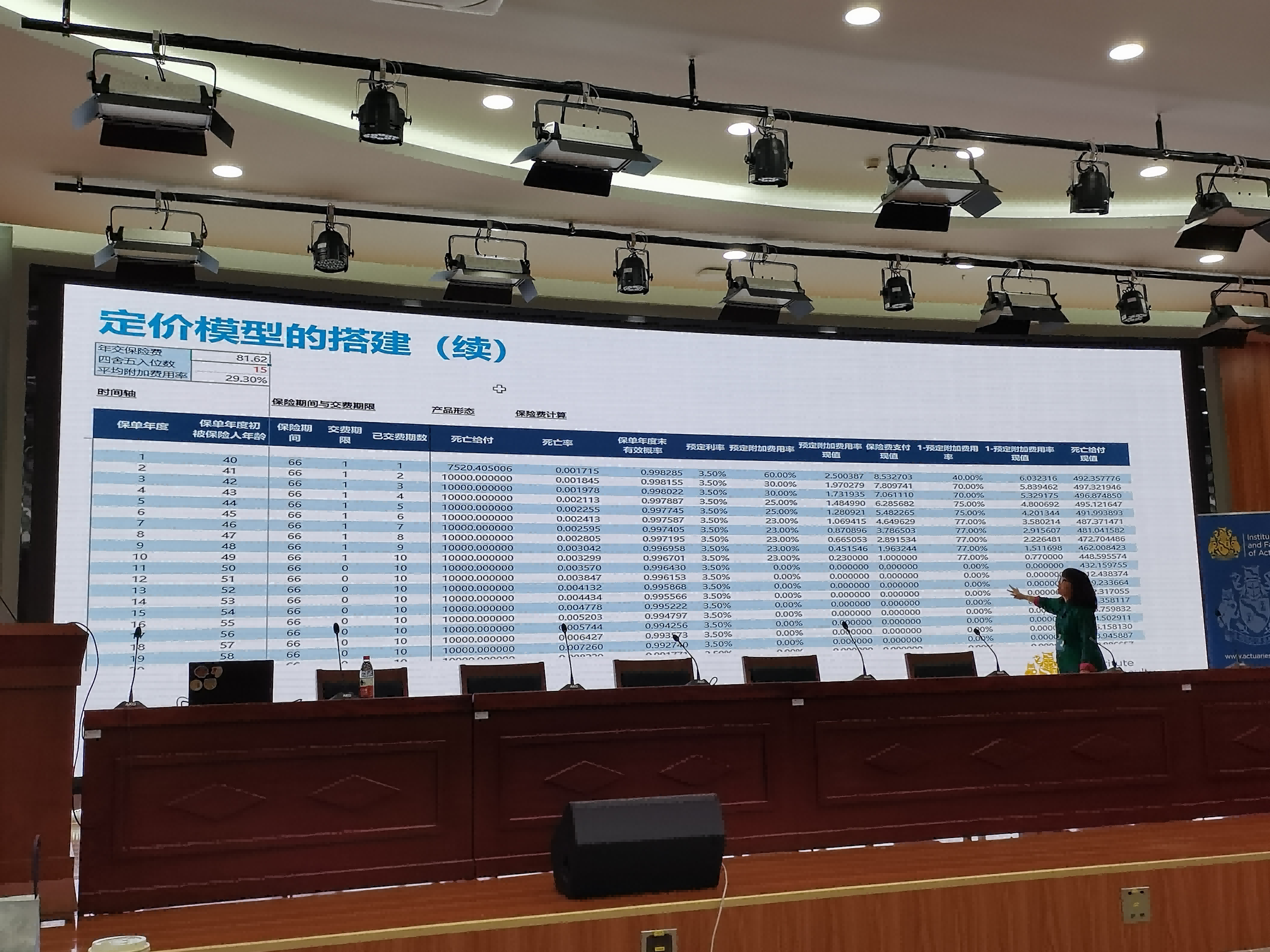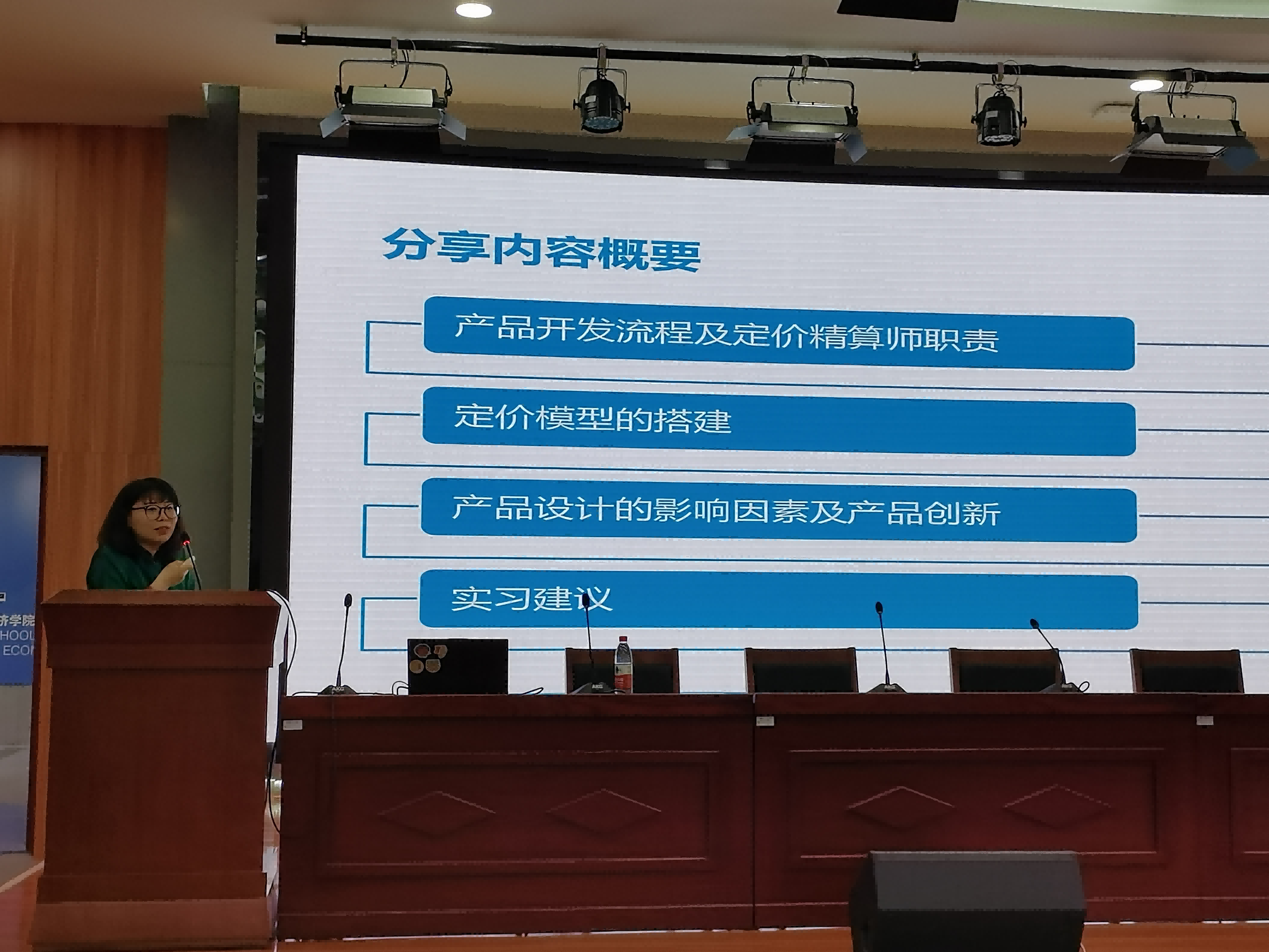 瑞士再保险公司寿险与健康险再保险定价精算师李佳蓉女士带来了《寿险产品开发实践》的主题讲。李佳蓉精算师在保险行业有着丰富的职业经历,她结合自己的工作经验,详细阐述了寿险产品开发流程以及定价精算师的职责,并演示了定价模型的构建。从理论模型推导到编程建模应用,再到费率合理性的验证和判断,她的讲解细致全面,深入浅出,干货满满。李佳蓉女士也从多个方面分析了产品设计的影响因素及如何进行产品创新,引发同学们的深度思考。最后,李佳蓉女士结合自身经历为大家提出了许多切实细致的实习及工作建议,令同学们受益匪浅。