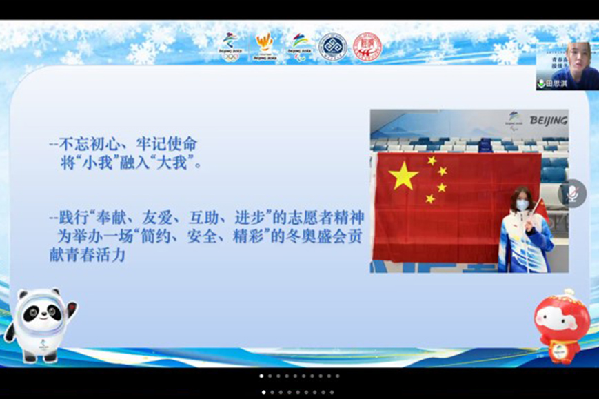来自保险本科生党支部的田思淇同学以“不忘初心,共赴未来”为主题,从“启程”、“旅途”、“工作中的小确幸”、“凯旋”等方面分享了她的冬奥之旅,向同学们介绍了她在冬奥志愿服务期间,工作及生活中的难忘经历。此后,田思淇同学分享了自己的冬奥体悟,首先她提出党员要勇于担当,时刻发挥党员模范带头作用。其次要甘于奉献,用心做好冬奥盛会的一颗“螺丝钉”。最后还提到要做到不忘初心、牢记使命,将“小我”融入“大我”。最后田思淇同学表示:作为一名新时代的新青年,一名共产党员,不仅要当一面反映中国青年形象的镜子,更要做一扇展示中国未来的窗口。同时她也向同学们提出,希望能够有更多同学参与到志愿服务之中。