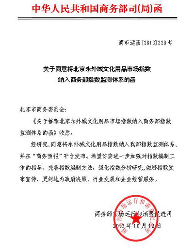 北京永外城文化用品市场指数于2011年1月1日正式公开发布,先后在《中国市场》、《中国商品交易市场》、市场网站、第105届中国文化用品交易会、2011年广州亚太文化用品交易会上公开发布和推介。北京永外城文化用品市场指数是继中国义乌小商品指数、北京中关村电子市场指数等中国商品交易市场13个特色指数后,首个全国性的文化用品市场指数。该指数由永外城文化用品有限公司、yl23455永利官网联合编制,经过深入的市场调查,确定指数品种分类、指数信息采集点和建立数据模型,最终确定了数据编制模式。
