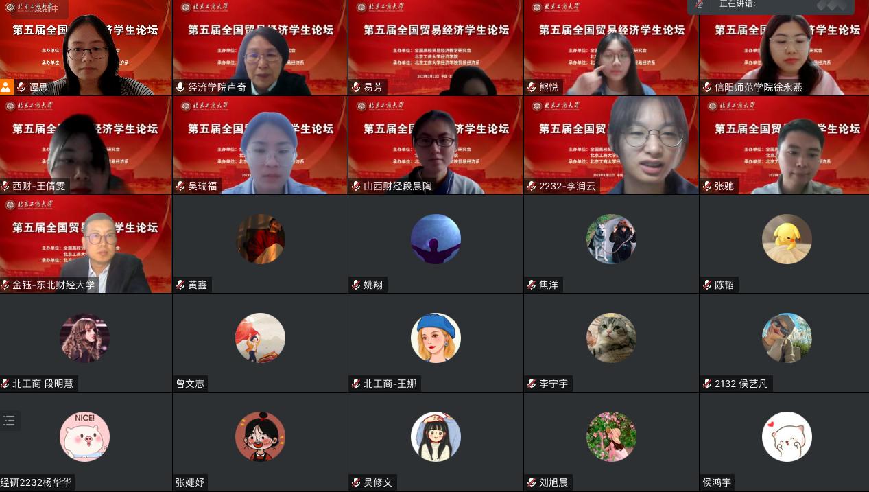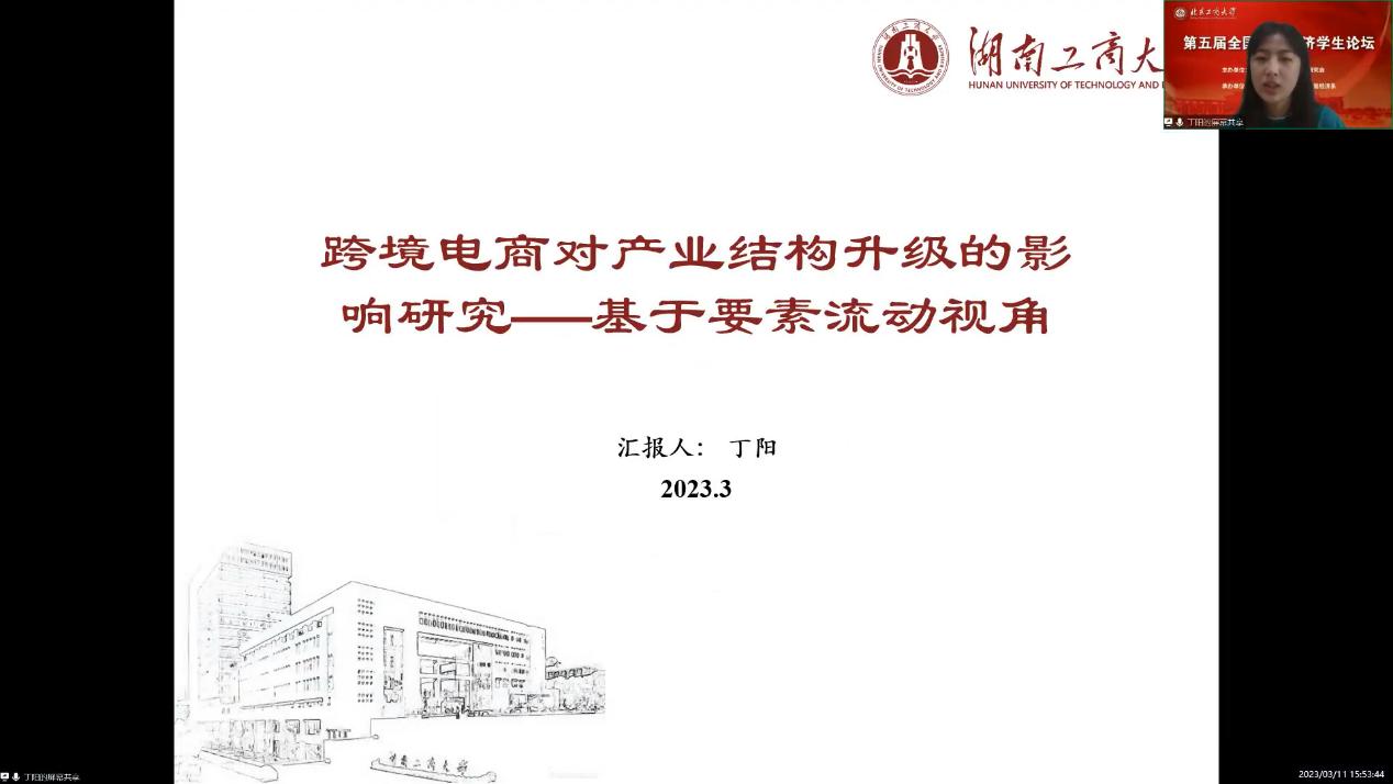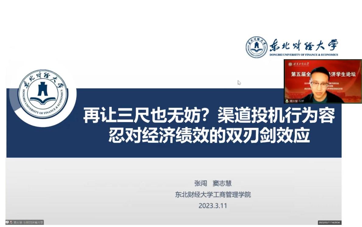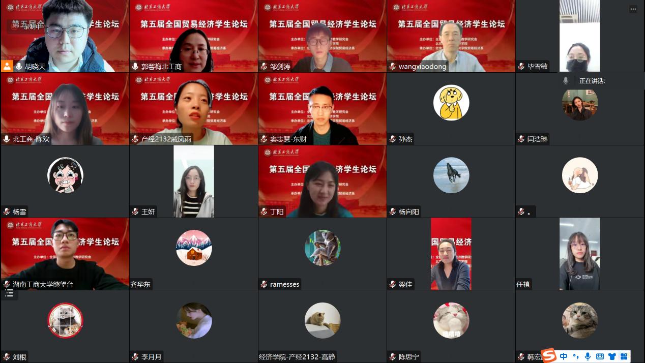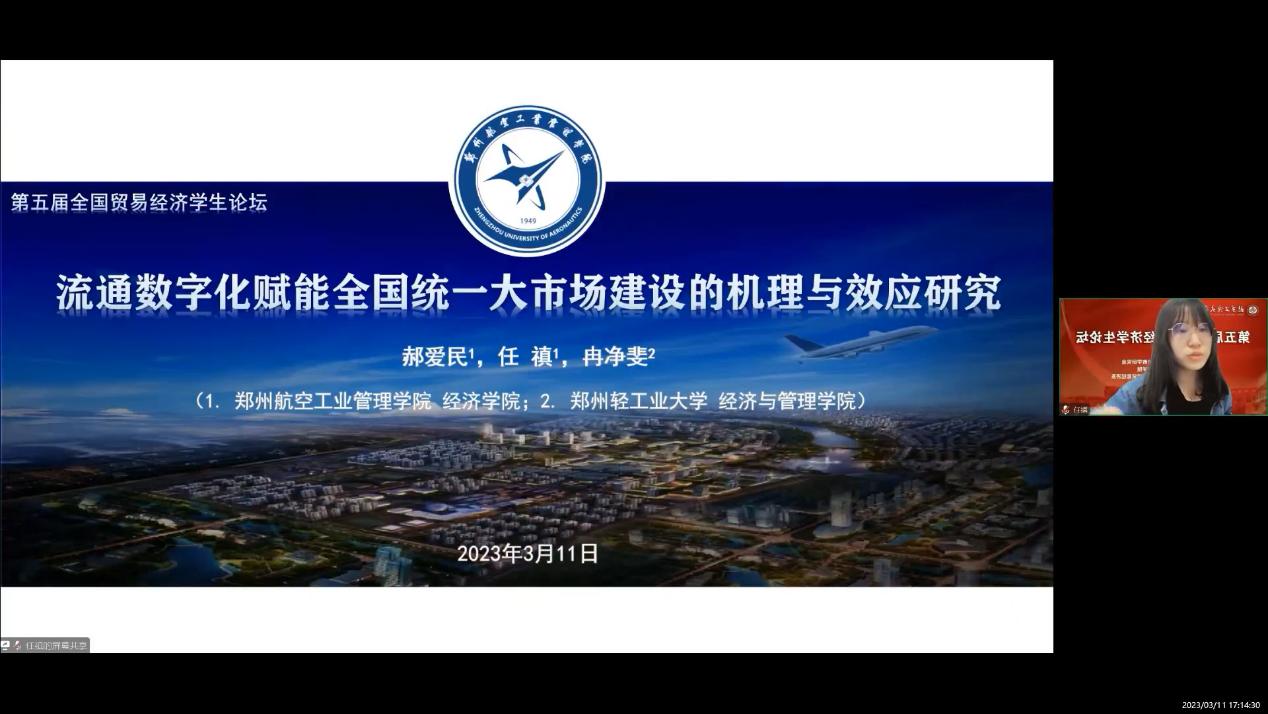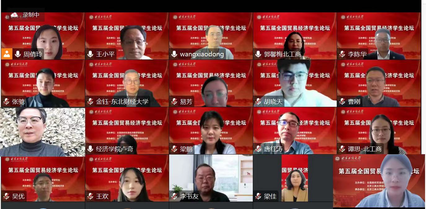2023年3月11日,第五届全国贸易经济员工论坛由全国高校贸易经济教学研究会、yl23455永利主办,贸易经济系线上承办。全国高校贸易经济教学研究会会长、中国人民大学王晓东教授,全国高校贸易经济教学研究会秘书长、南京审计大学李陈华教授,东北财经大学流通研究院副经理金钰教授、河北经贸大学商公司王小平教授、湖南工商大学经济与贸易公司唐红涛教授、南京审计大学澄园书院副经理梁佳副教授、重庆工商大学yl23455永利张驰副教授作为评审和点评嘉宾应邀出席了开幕式。来自西安交通大学、西南财经大学、东北财经大学、重庆工商大学、南京审计大学、湖南工商大学、南京财经大学、山西财经大学、郑州航空工业管理公司和yl23455永利官网近20所高校200余名师生参加了论坛。开幕式由公司yl23455永利贸易经济系郭馨梅教授主持。