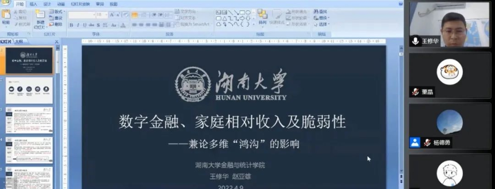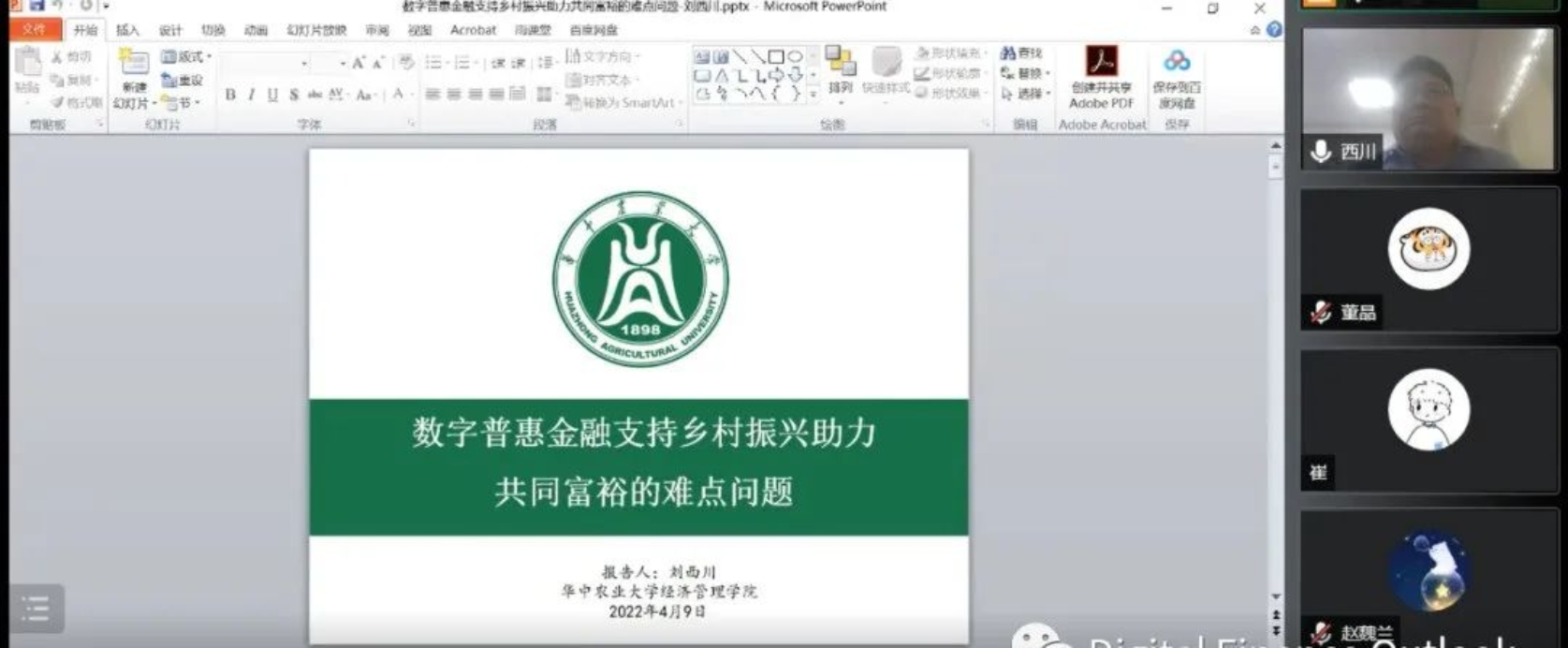 2022年4月9日上午,由yl23455永利官网主办、yl23455永利官网数字金融研究中心和yl23455永利官网区域金融工程研究中心联合承办的“推进农村金融数字化转型 助力普惠金融高质量发展”学术研讨会成功召开。本次会议通过腾讯会议的形式召开,同时通过学说平台进行直播。据不完全统计,参与腾讯会议室和学说平台直播的听众近5000人。