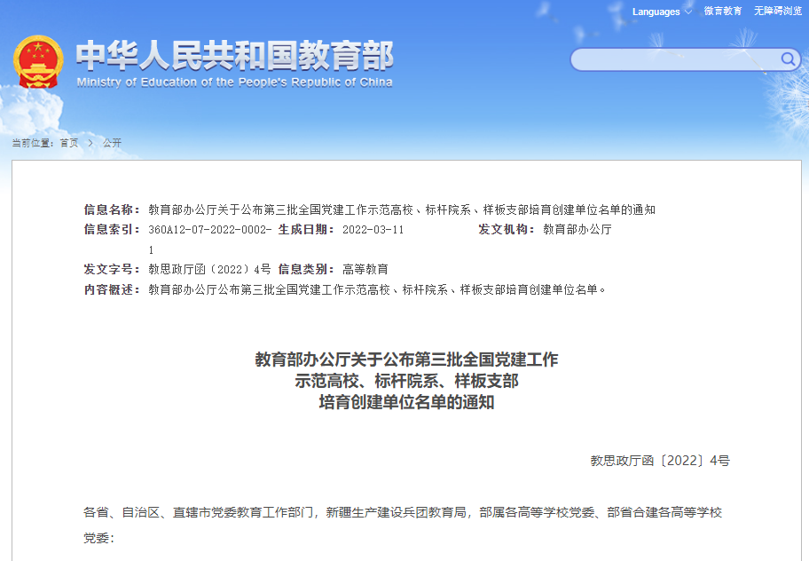 本次评审是根据《教育部办公厅关于开展第三批新时代高公司党建示范创建和质量创优工作的通知》(教思政厅函〔2021〕16号)安排和遴选工作方案,经省级党委教育工作部门推荐、资格审查、专家评审、教育部党的建设和全面从严治党工作领导小组成员单位集中审议,遴选产生了11个全国党建工作示范高校、100个全国党建工作标杆院系、1000个全国党建工作样板支部。